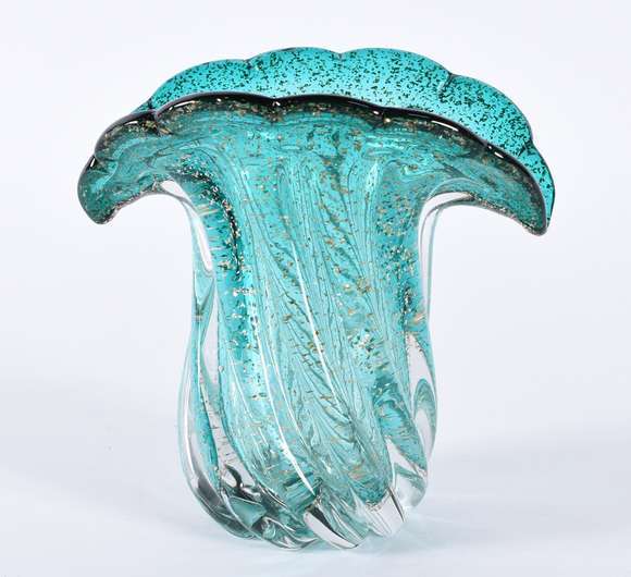 Vaso de vidro decorativo na cor verde com pó de ouro.