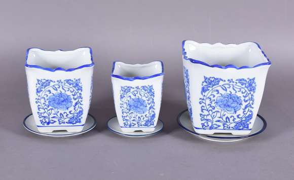 Lote arrematadoLote 298 - Ao vivo! Conjunto composto de 3 cachepots de porcelana azul e branca com pratinhos de base. 15 cm / 14 cm / 12 cm