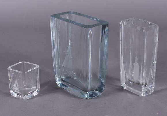 Lote arrematadoLote 653 - Ao vivo! Três vasos de bloco de cristal sueco, assinado. 15 cm / 16 cm