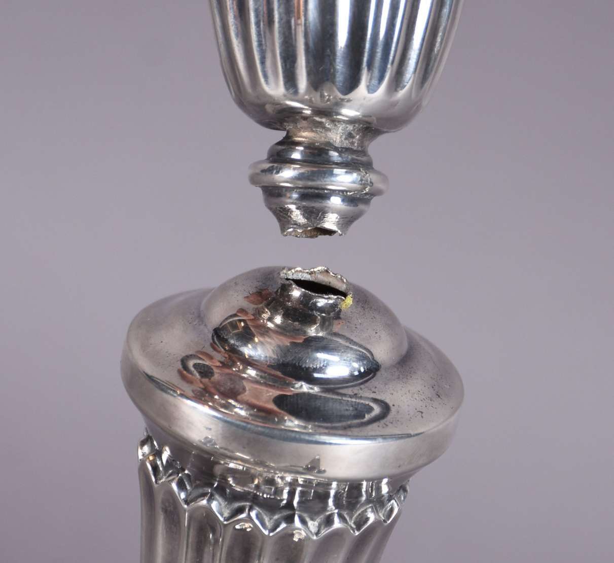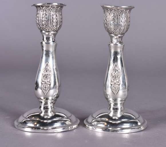 Par de castiçais de prata, pequenos amassados. Peso da prata: 1440 g (Por motivos de segurança a peça não se encontra...