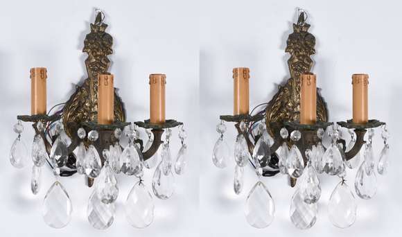Par de apliques de metal com pingentes lapidados e para 3 luzes.