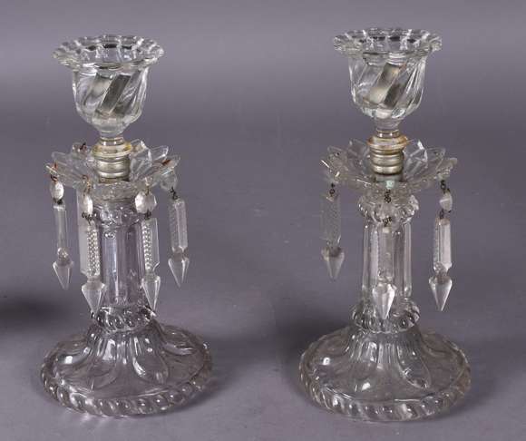 Par de antigos castiçais de cristal europeu com bordas acordoadas, pingentes lapidados (faltando alguns).