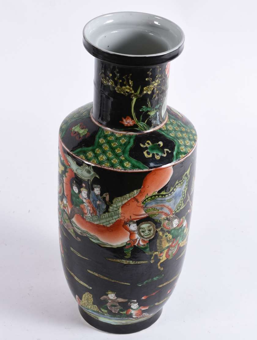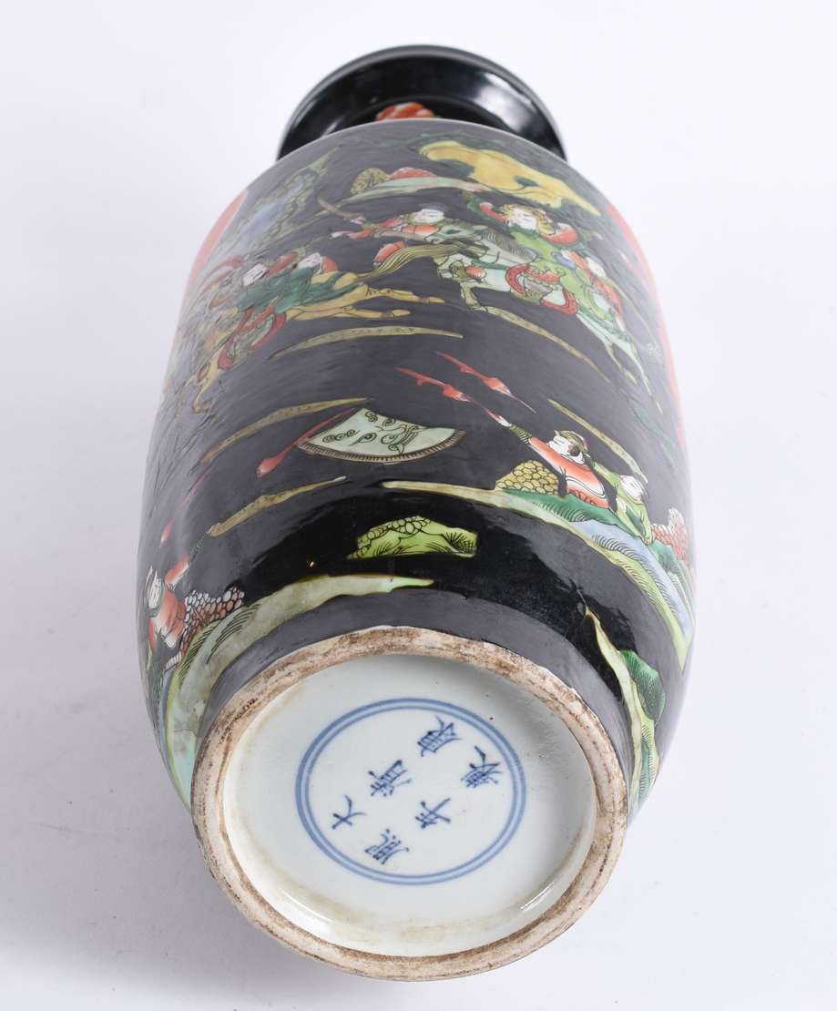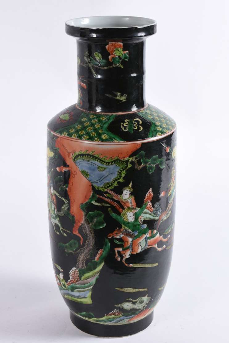 Par de vasos em porcelana chinesa de formato globular, comlongos gargalos, ornados em policromia da Famille Verte por...