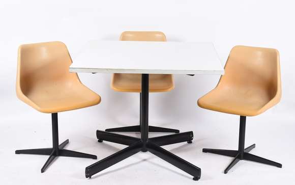 ROBIN DAY DESIGN - Conjunto de mesa com tampo de aglomerado revestido de fórmica branca (desgastado e com defeitos) a...