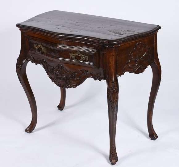 Mesa de encostar de jacarandá Dom José, uma gaveta com puxadores de metal, saia com entalhes rasos e ilhargas com dec...