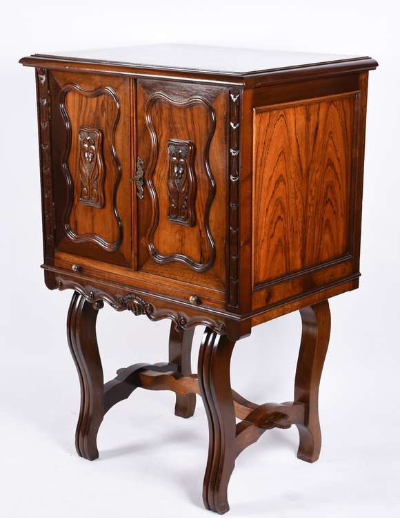 Móvel bar de madeira nobre, duas portas emolduradas, parte interna espelhada com prateleira de vidro. Prancha desliza...