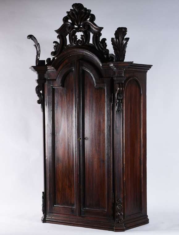 Antigo Oratório de madeira nobre, duas portas ogivais tendo na parte interna pinturas em policromia. Arremate superio...