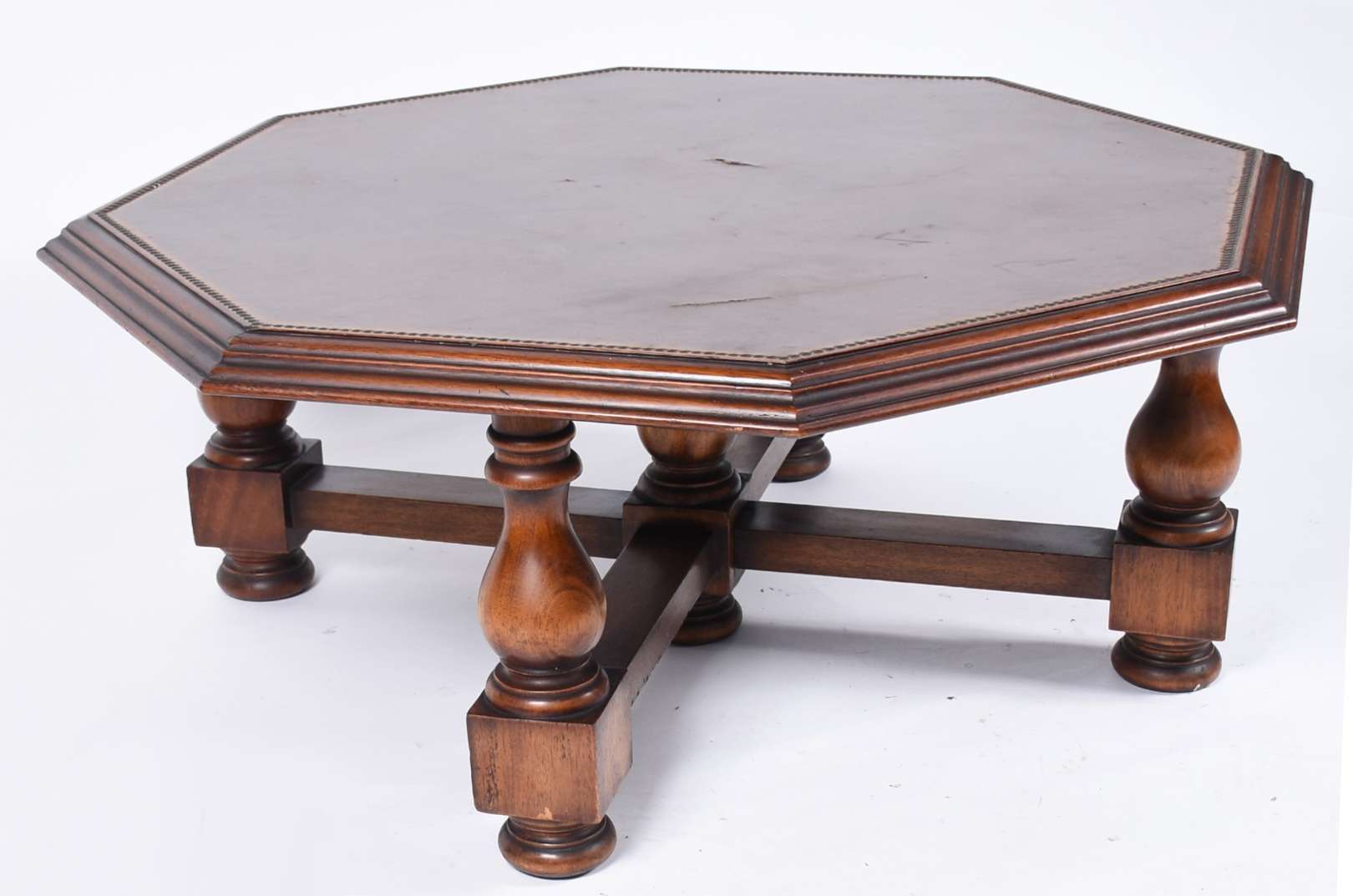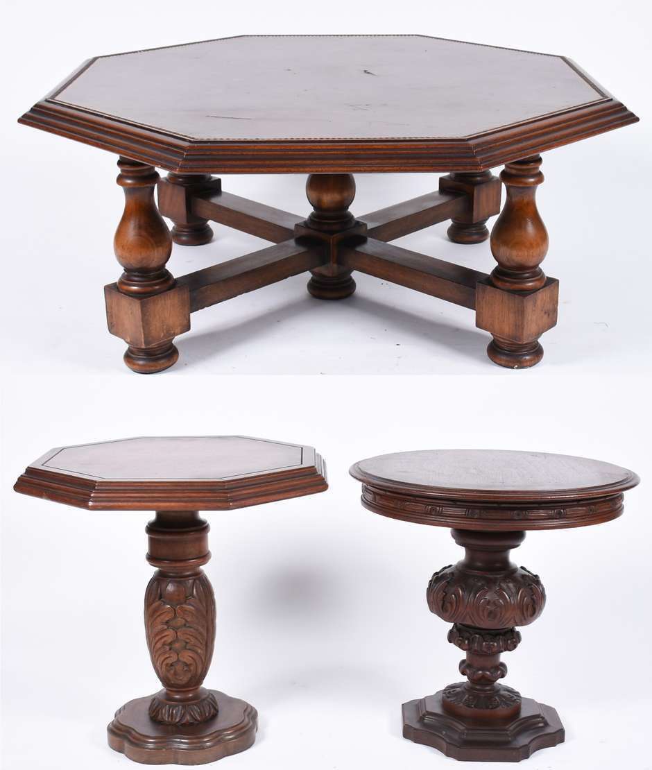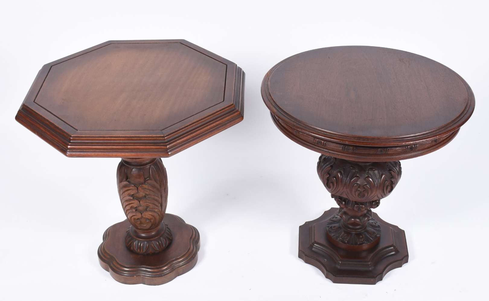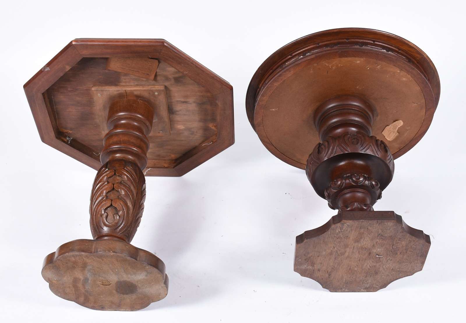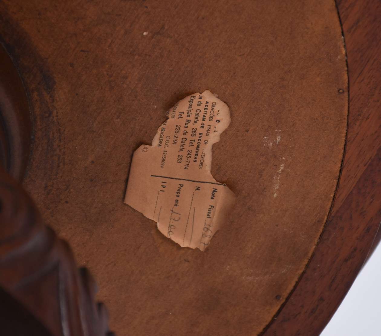 Mesa auxiliar de madeira nobre com tampo redondo, coluna central terminando em quatro pés, estilo Art Deco.