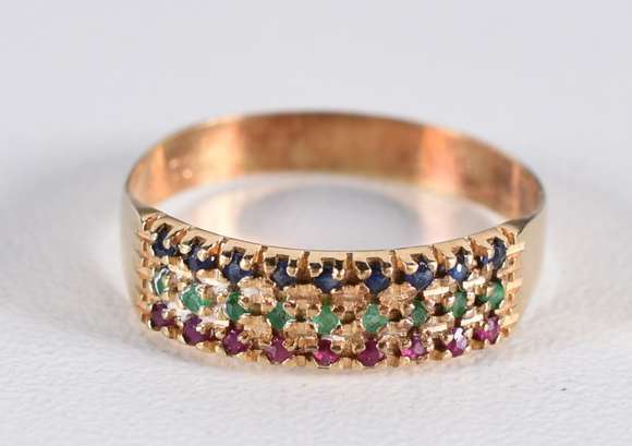 Anel de ouro 18 k contraste 750, cravejado com rubis e esmeraldas, aro 15 (Por motivos de segurança a peça não se en...