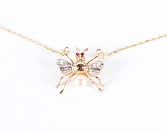 Cordão veneziano torcido com pingente de ouro 18 k em dois tons, feitio abelha com brilhantes nas asas e rubi nos olh...