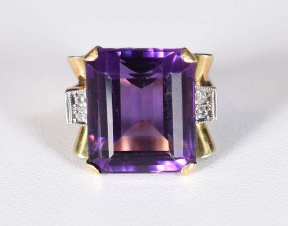 Anel de ouro baixo com pedra ametista de 4 mini brilhantes, aro 15 (Por motivos de segurança a peça não se encontra n...
