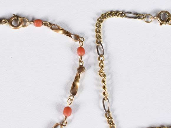 Duas pulseiras de ouro 18 k, sendo uma com pequenas pedras corais e a outra em elos menores intercalados por outros m...
