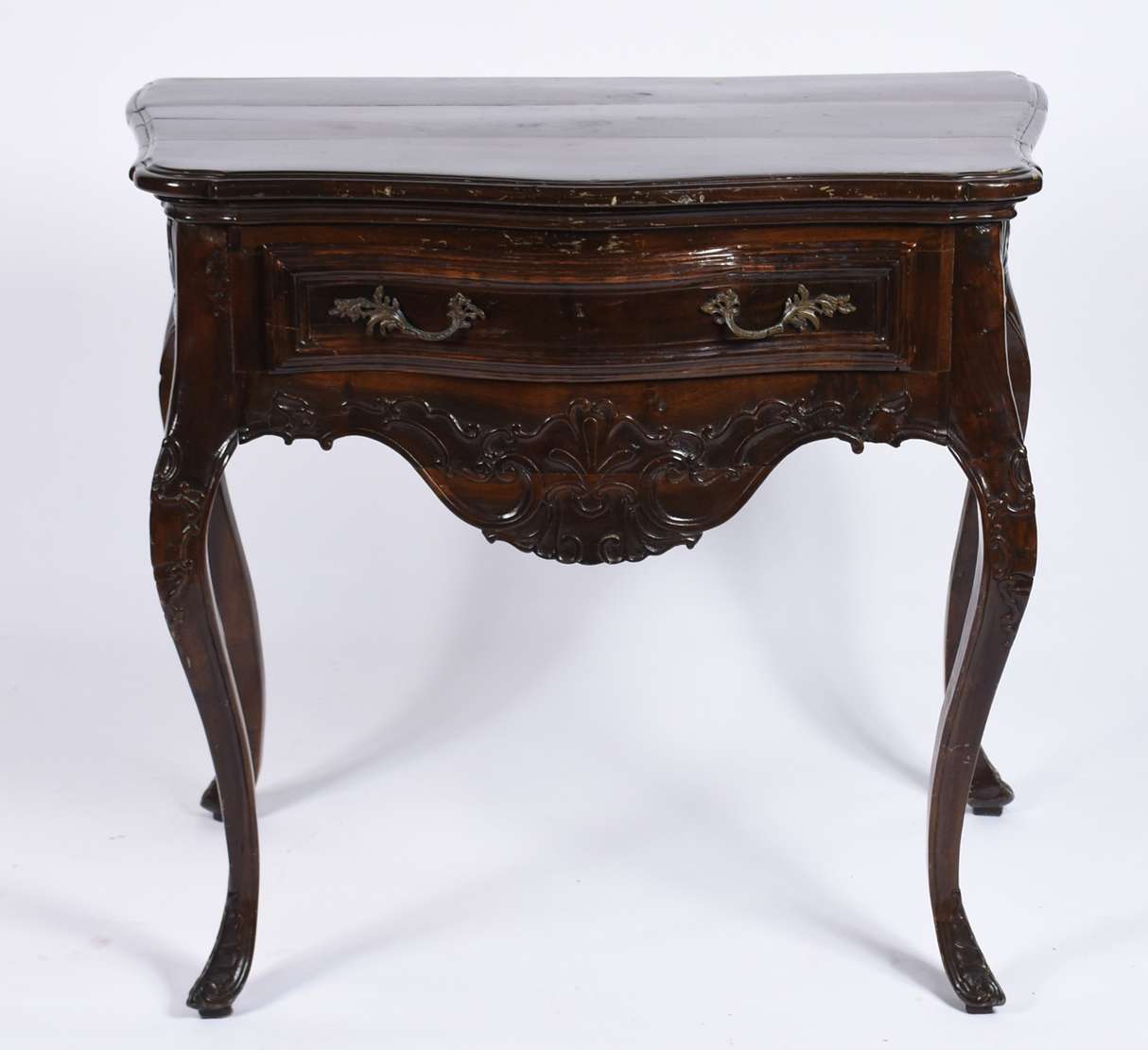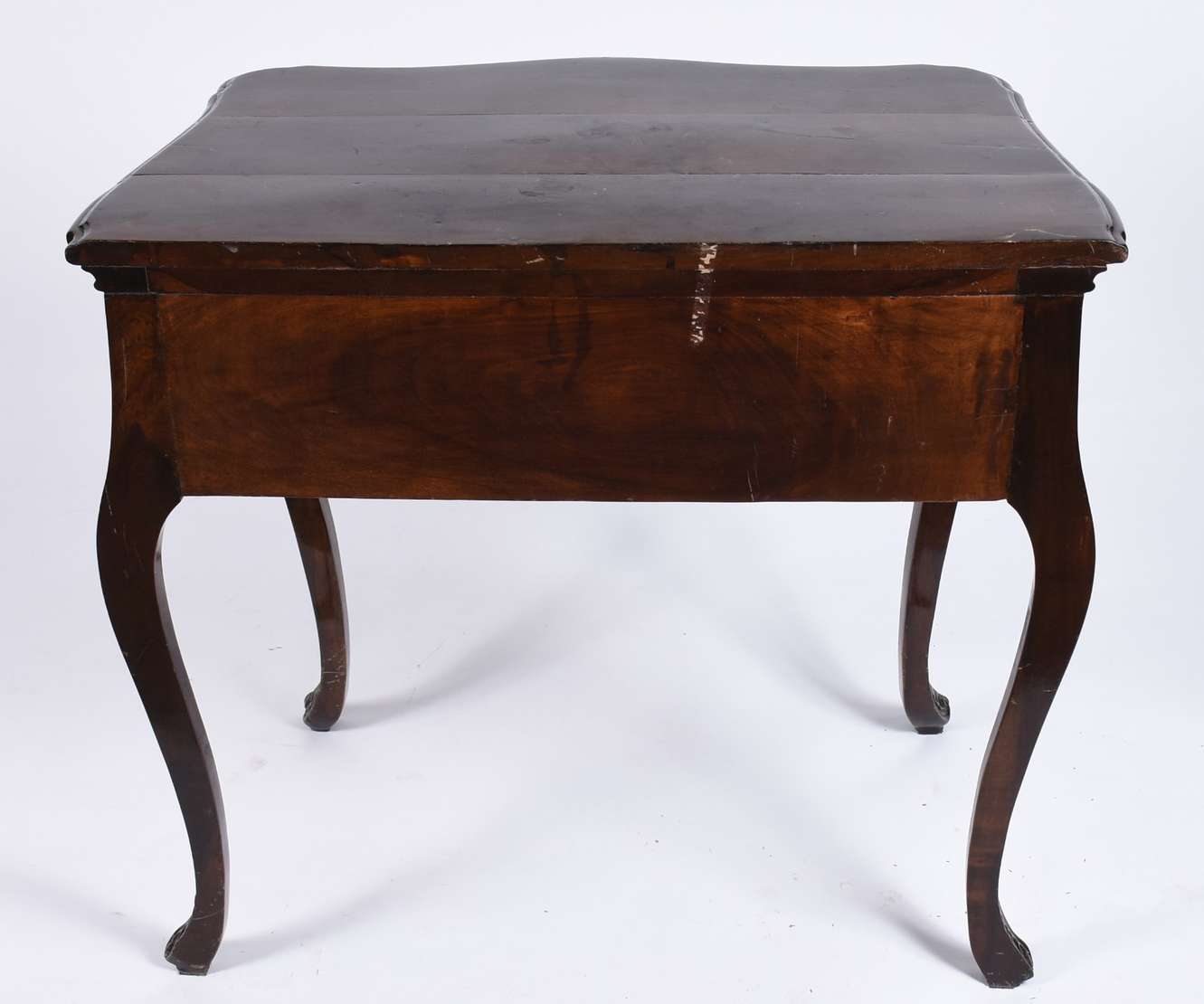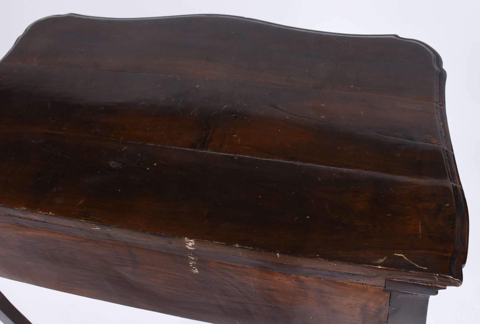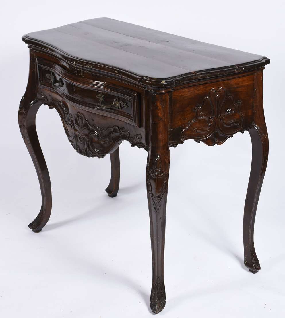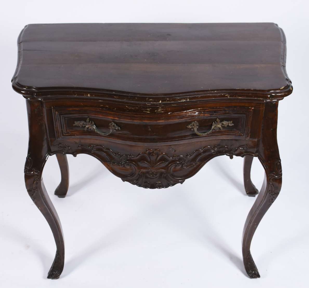 Mesa de madeira nobre com uma gaveta, pernas retas.