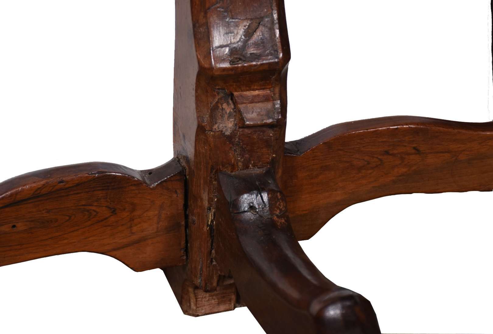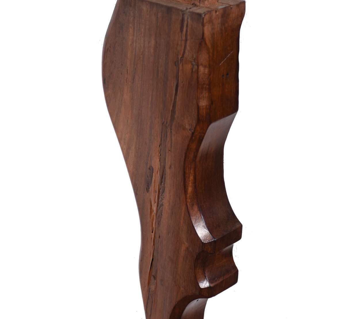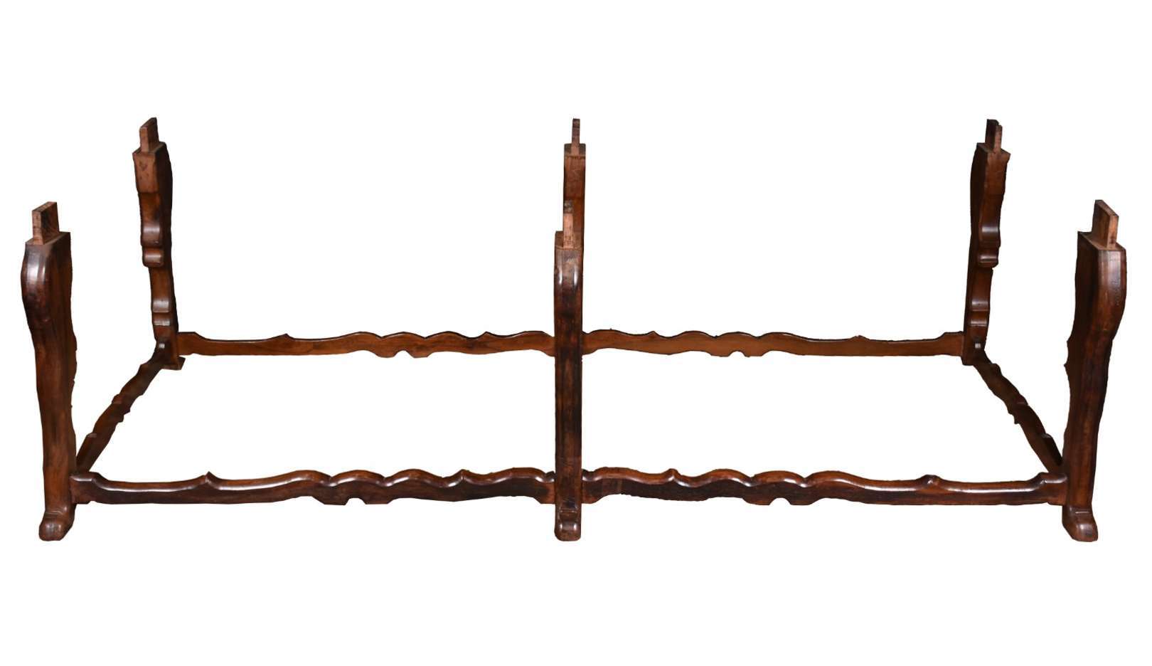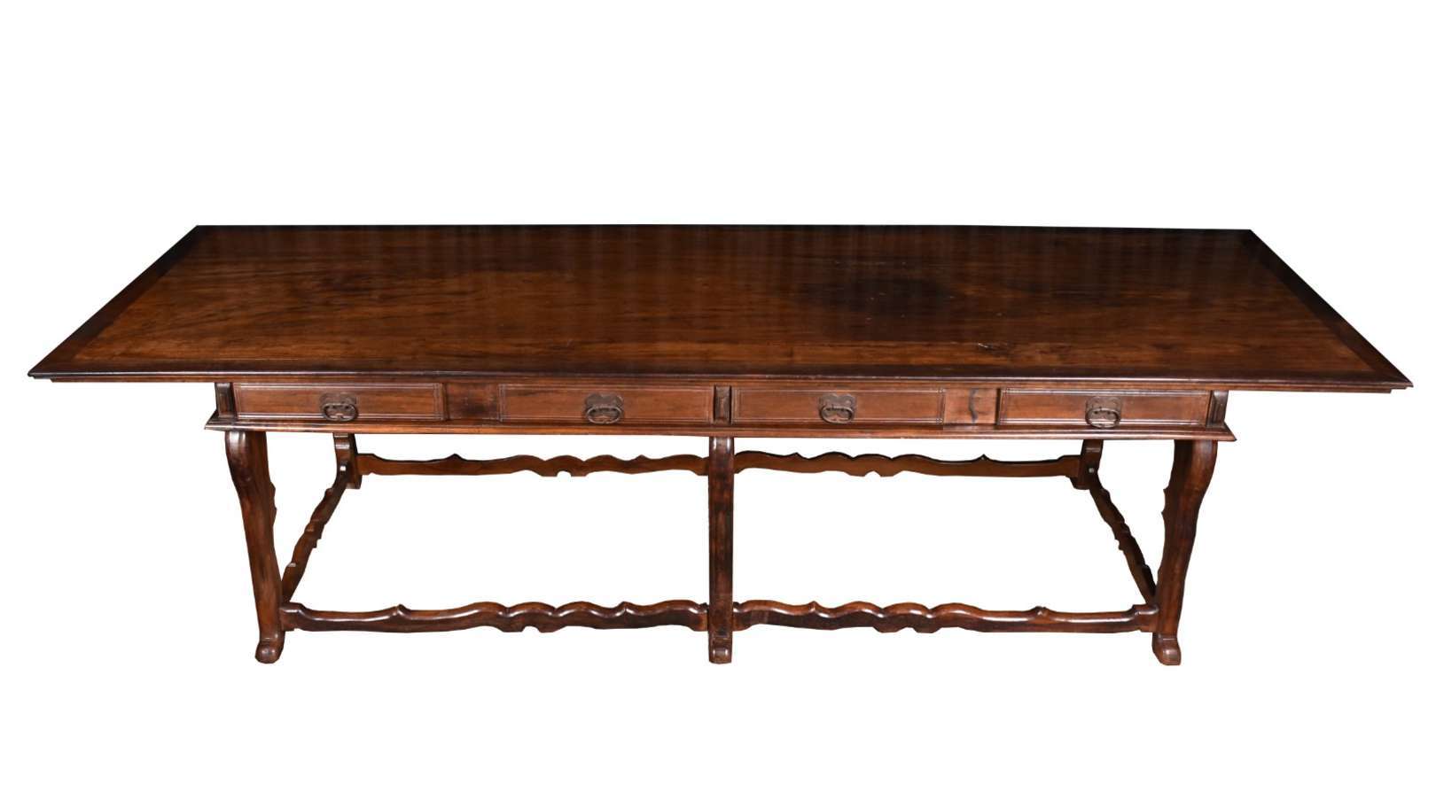 Excepcional mesa de madeira nobre, tampo feitio retangular com 2 gavetões, pernas recortadas unidas por traves inferiores.