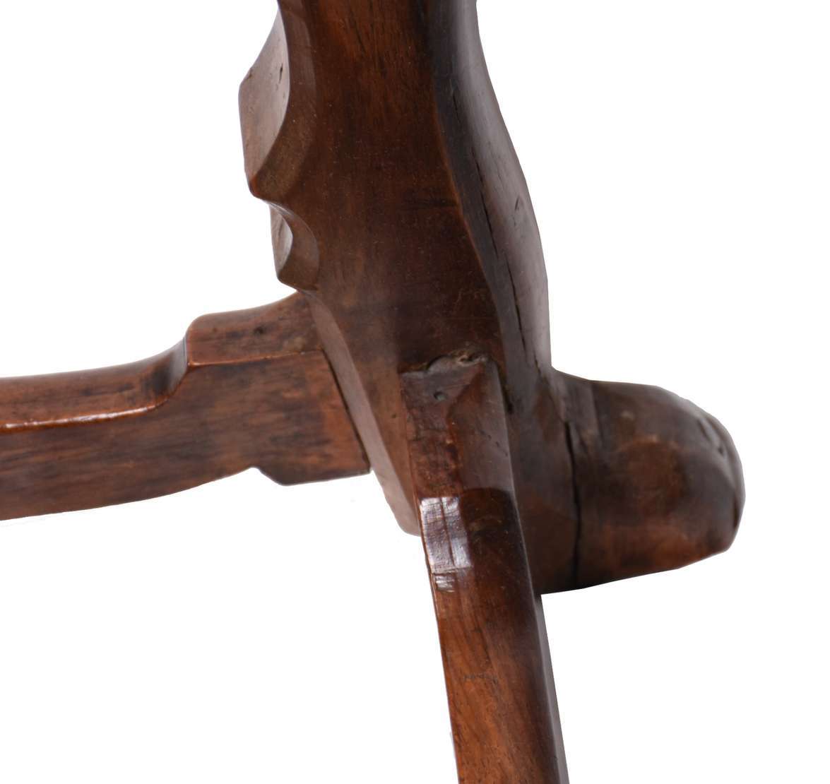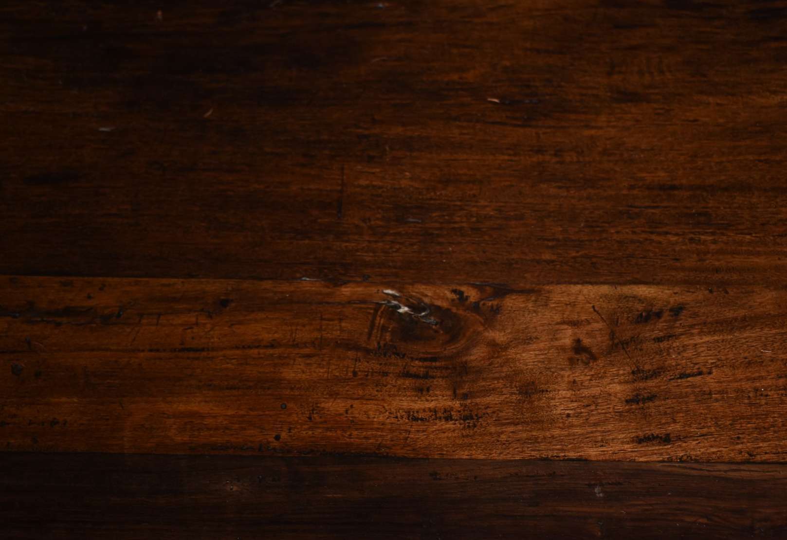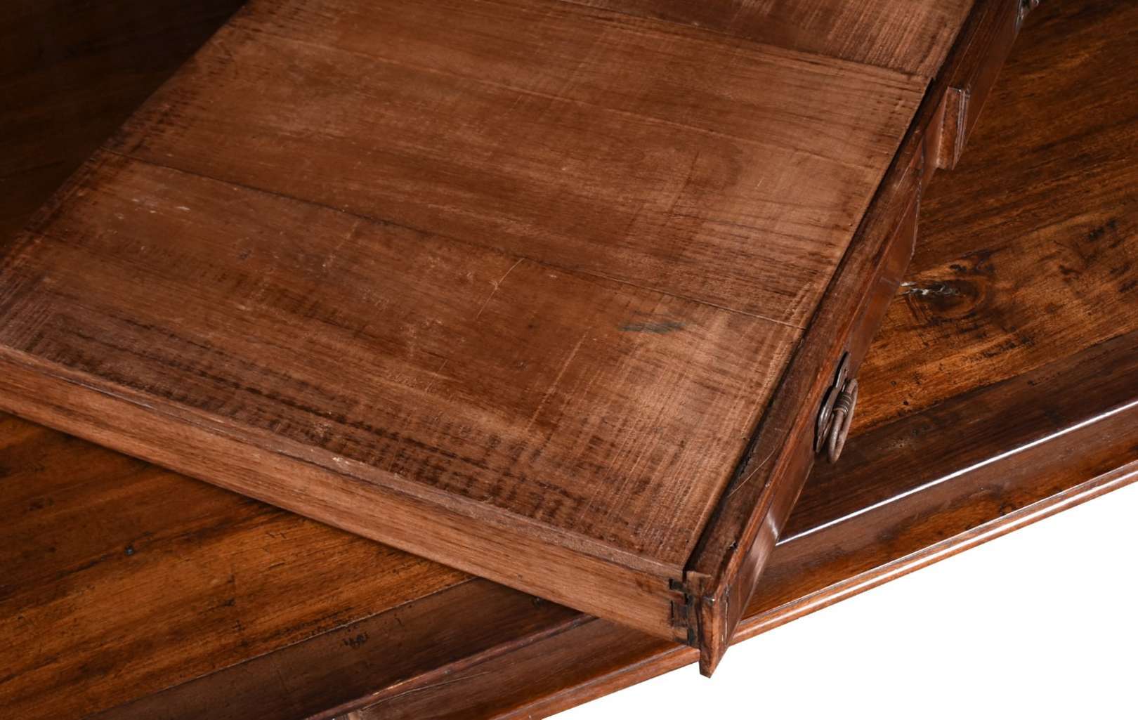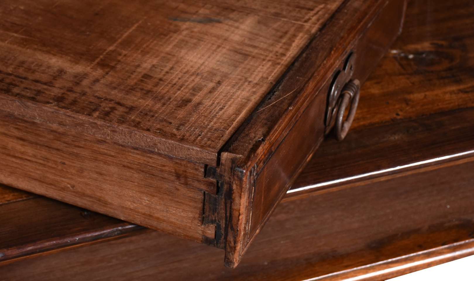 Excepcional mesa de madeira nobre, tampo feitio retangular com 2 gavetões, pernas recortadas unidas por traves inferiores.
