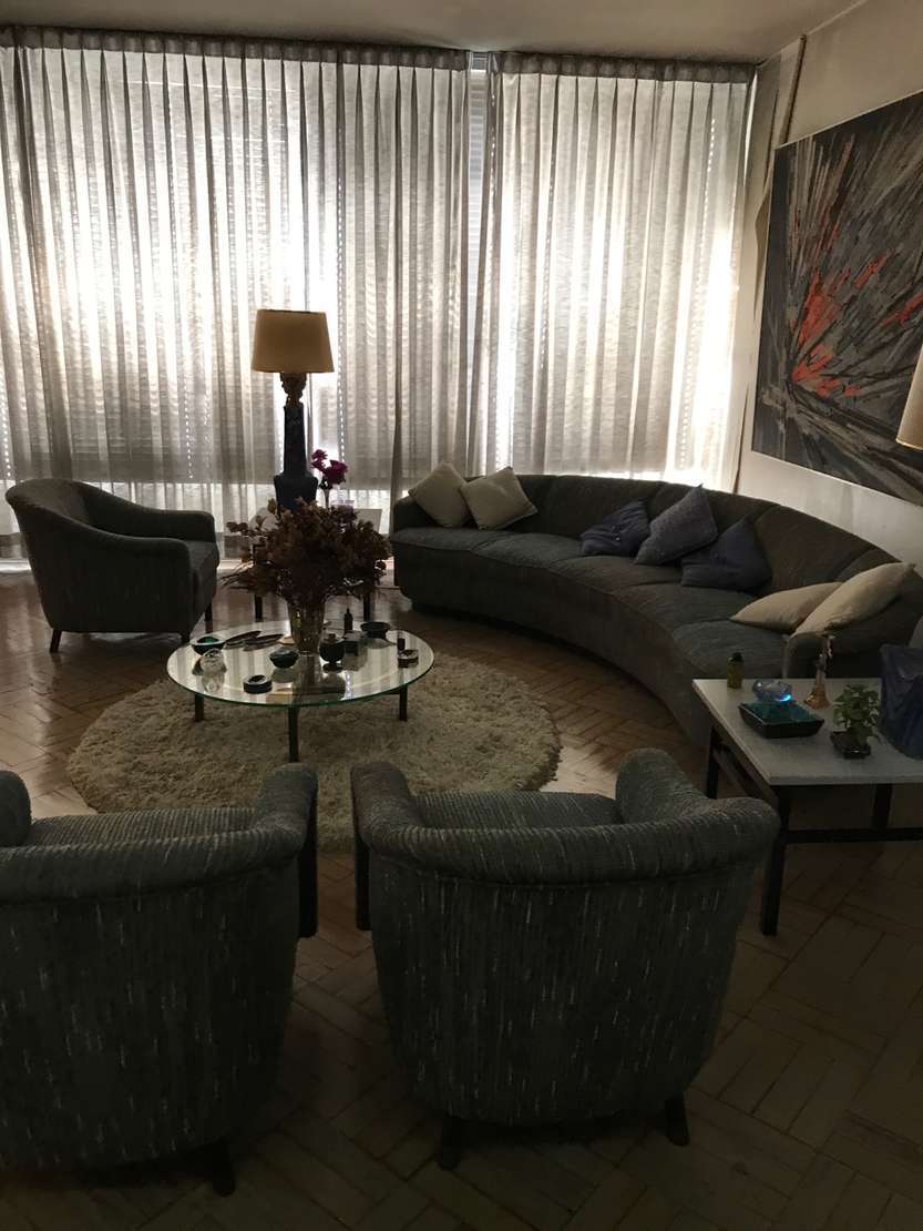 Mesa de jantar com base de madeira nobre recortada e tampo de vidro. Acompanham 4 cadeiras estilo inglês, assentos es...