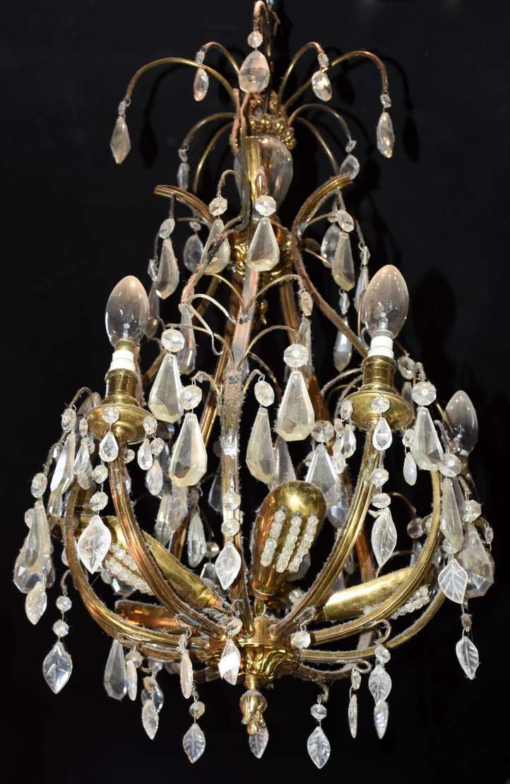Lustre com estrutura de metal dourado e pingentes de cristal lapidado, para 5 luzes.
