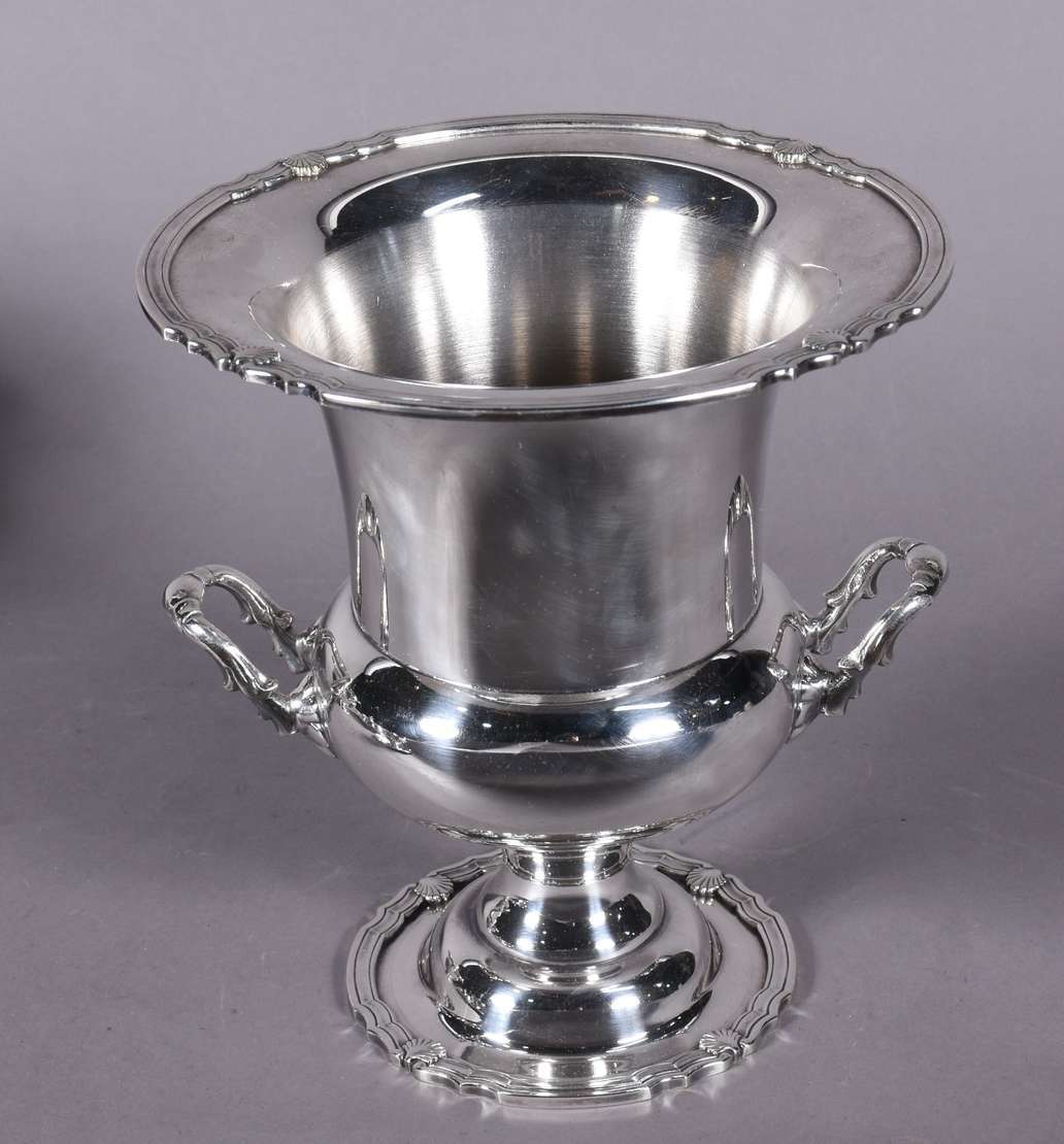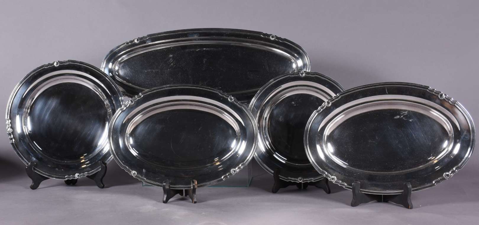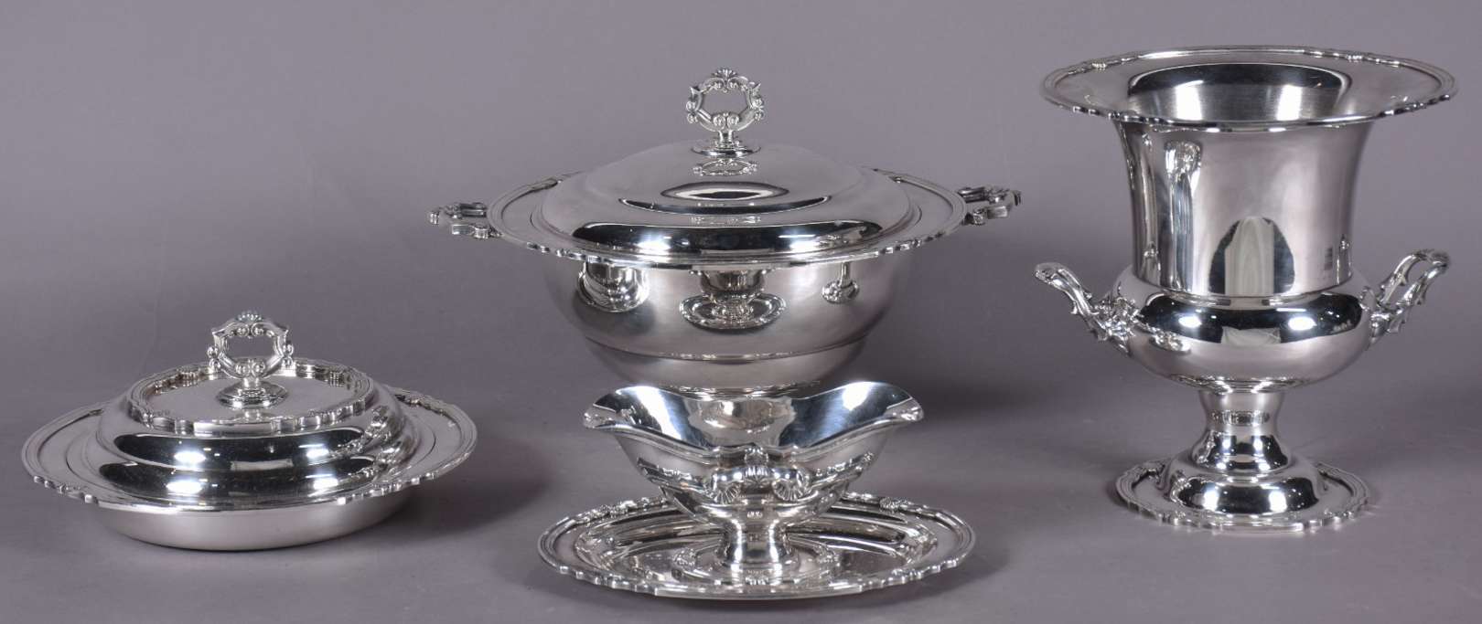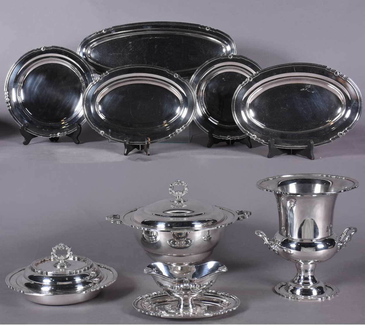 Baixela de metal prateado Eberle Alpaca, composto de: sopeira, molheira com presentoir, legumeira com tampa, 3 travessas ovais, 2 travessas redondas e balde para gelo. Total: 9 peças.