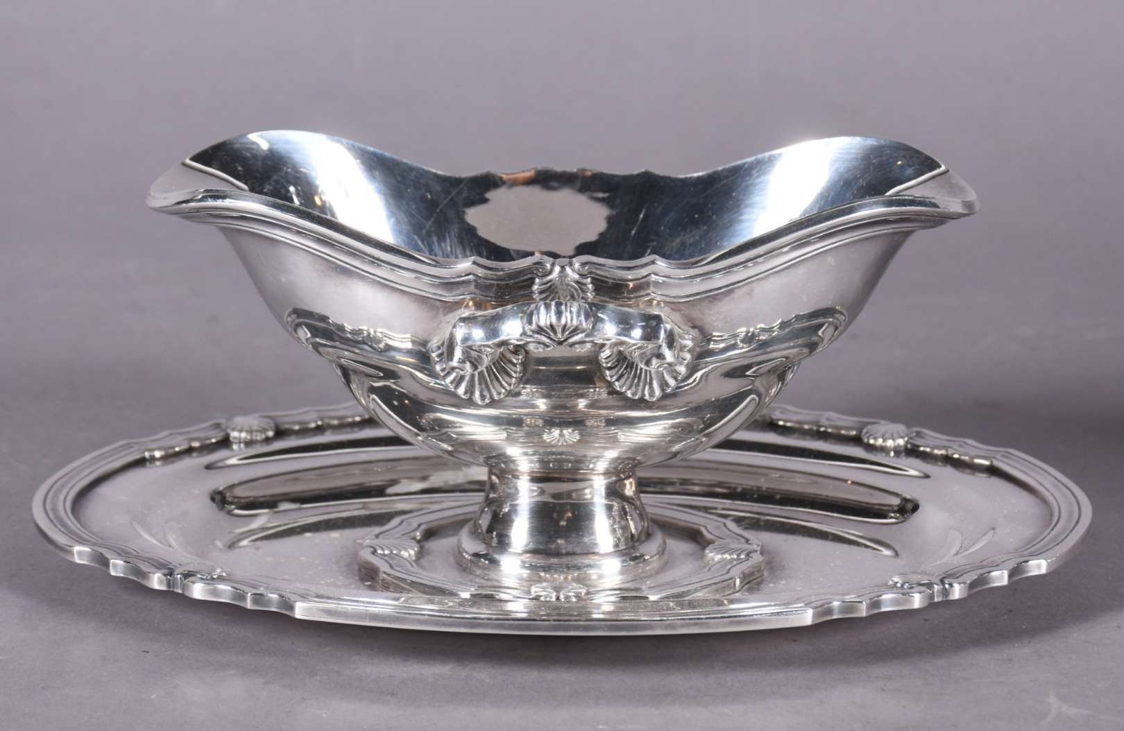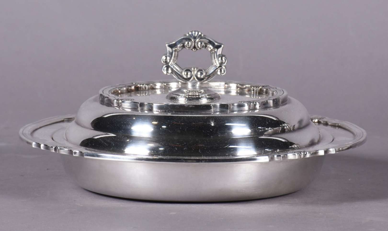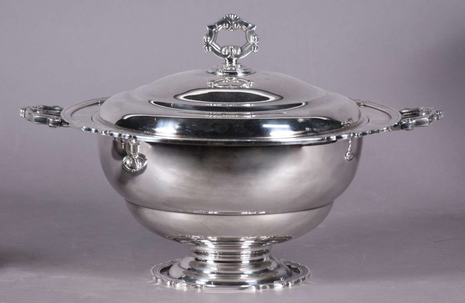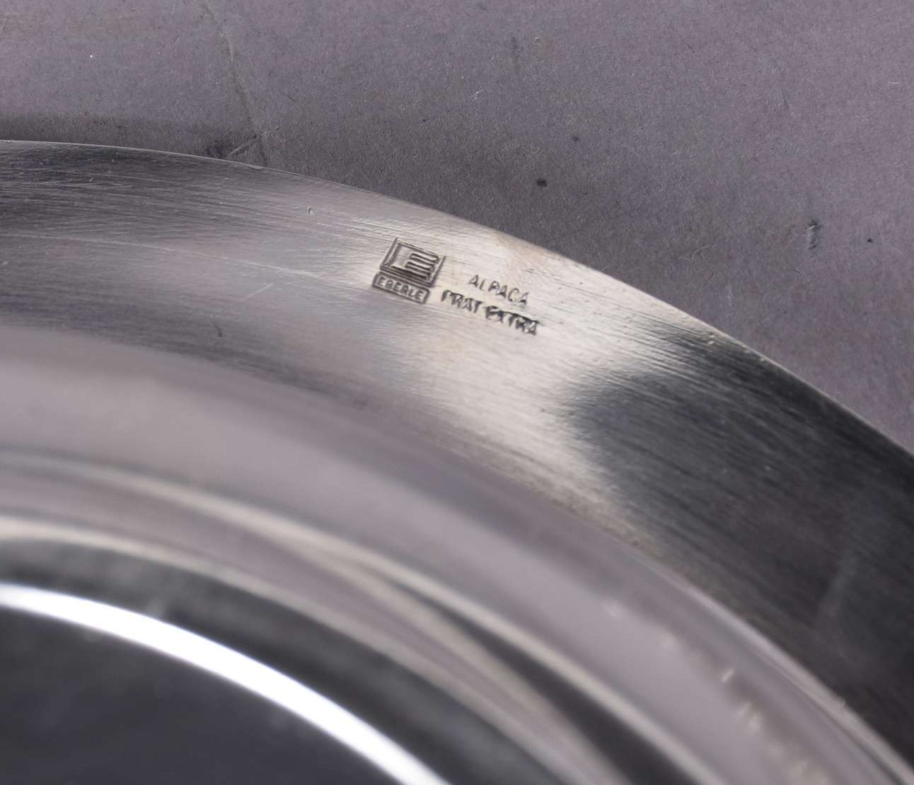 Baixela de metal prateado Eberle Alpaca, composto de: sopeira, molheira com presentoir, legumeira com tampa, 3 travessas ovais, 2 travessas redondas e balde para gelo. Total: 9 peças.