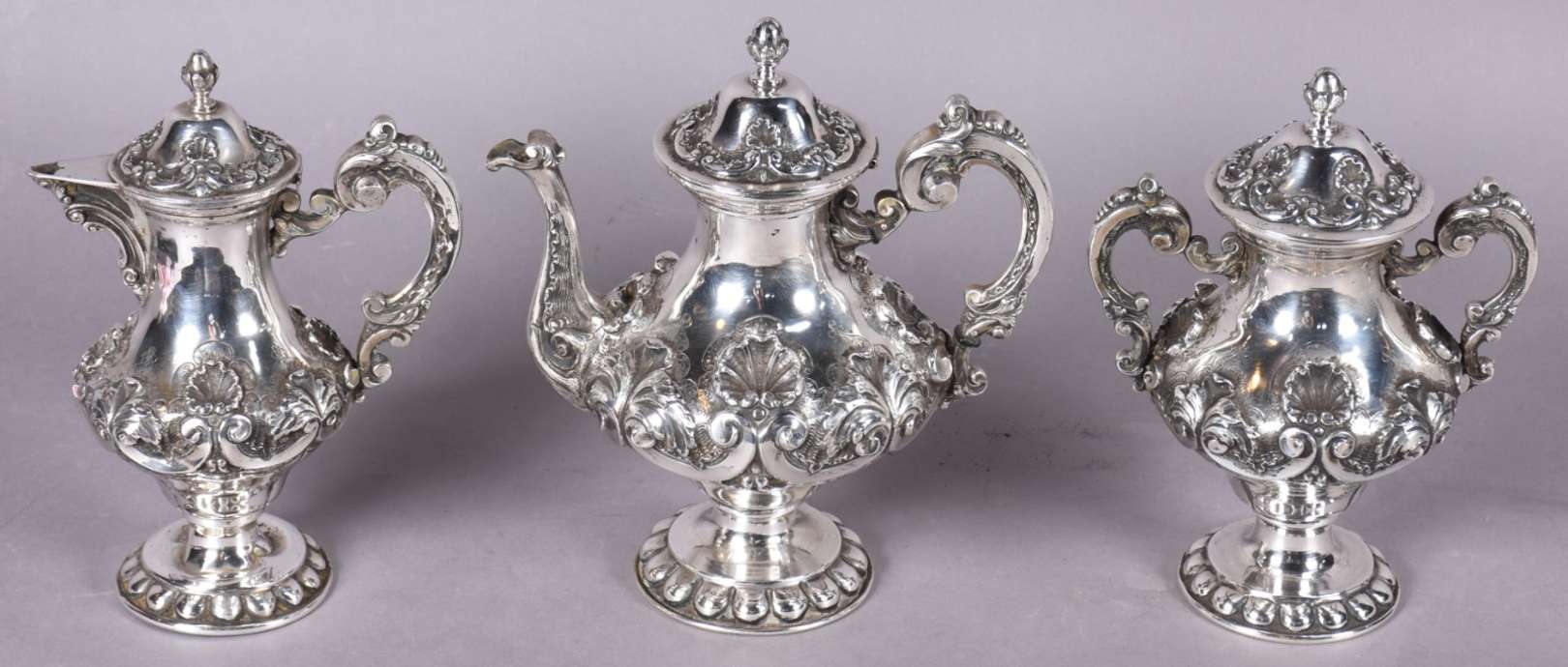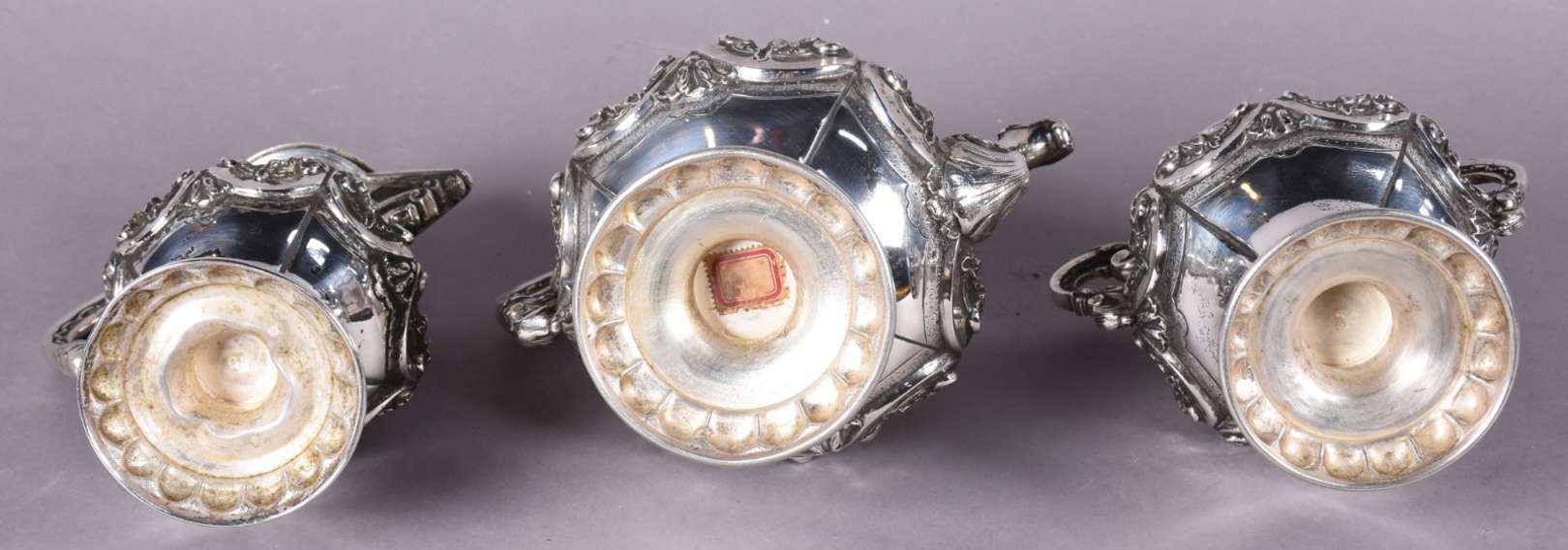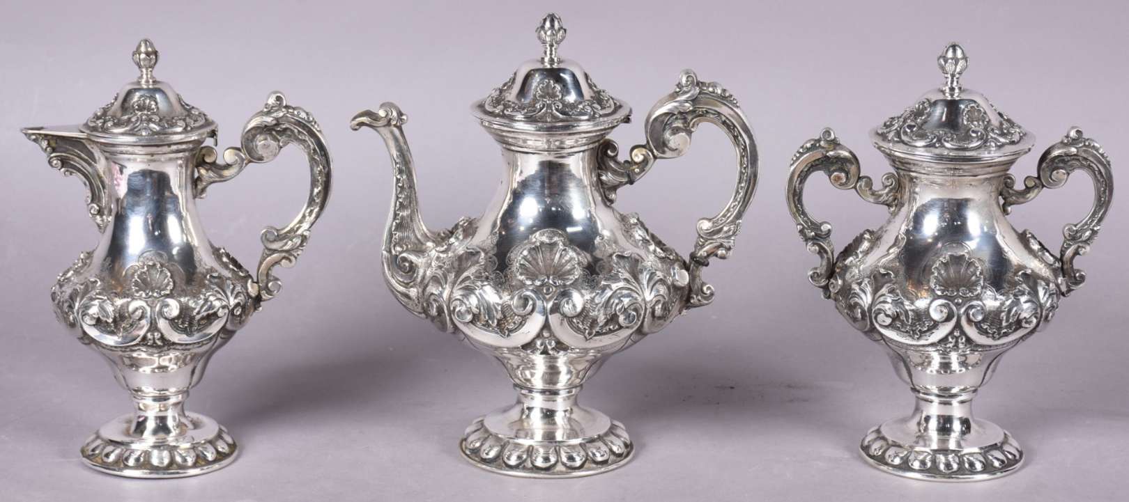 Baixela para chá e café de prata portuguesa contrastada, composto de: 2 bules, 2 açucareiros e leiteira. Bases em gom...