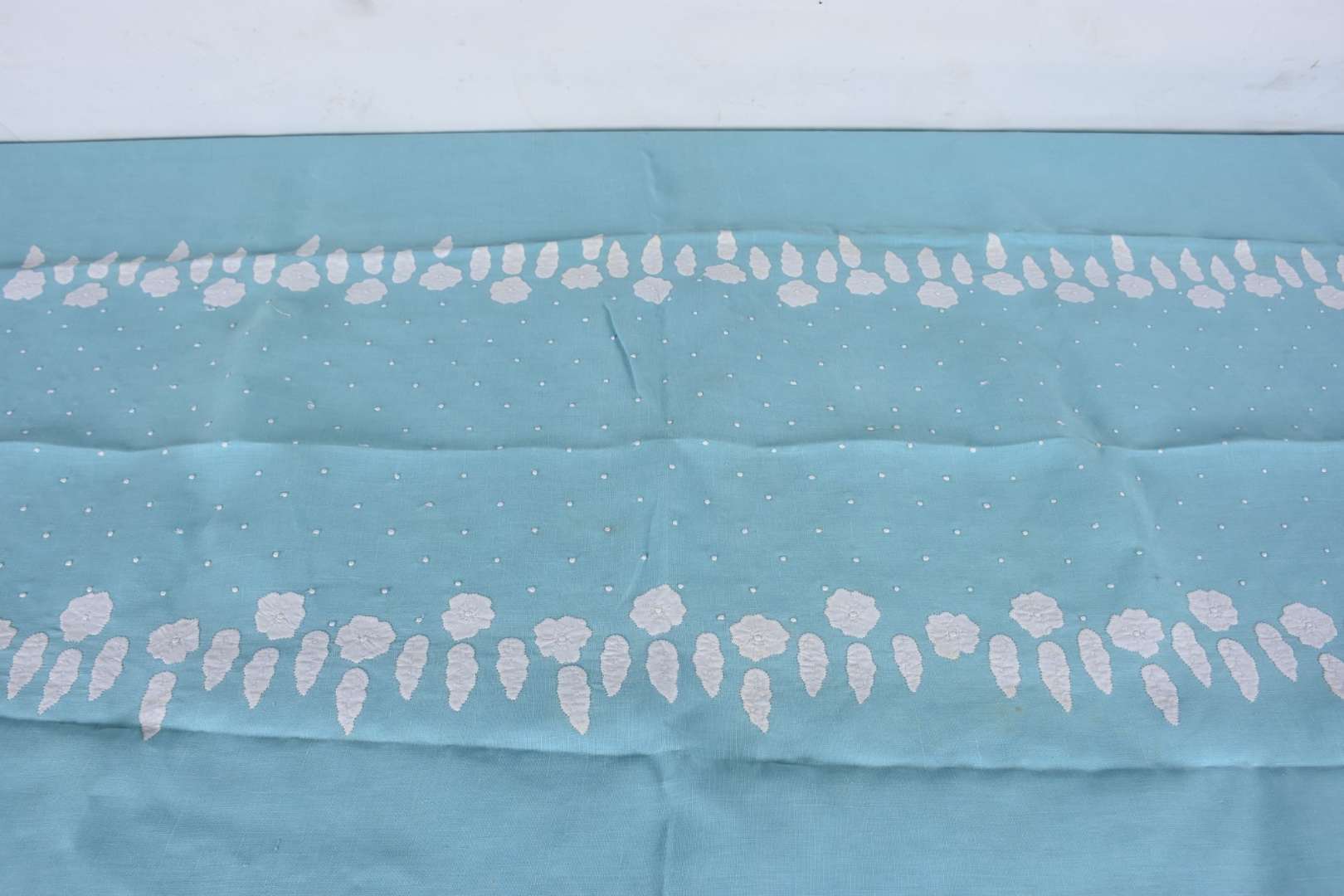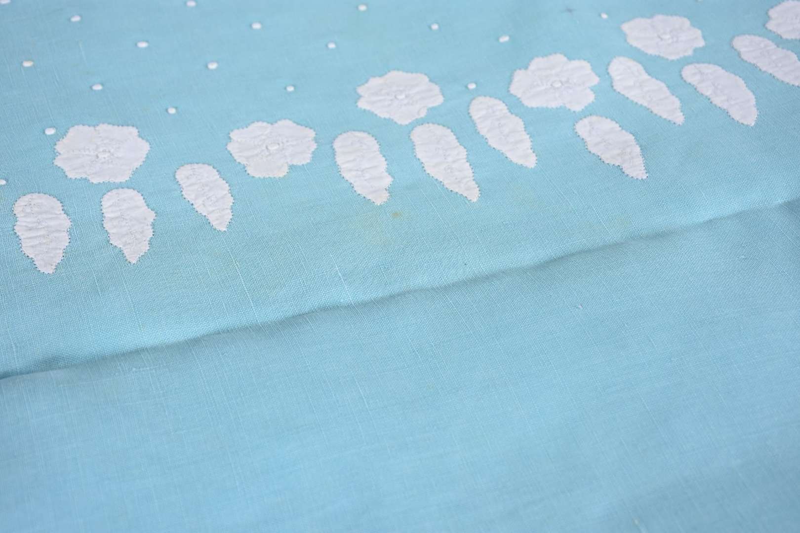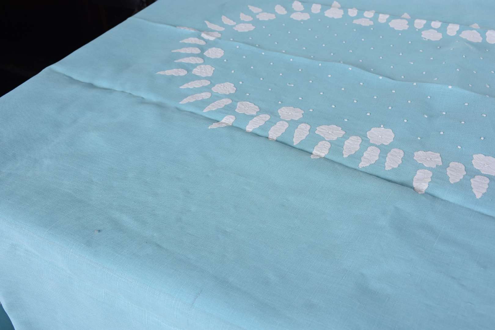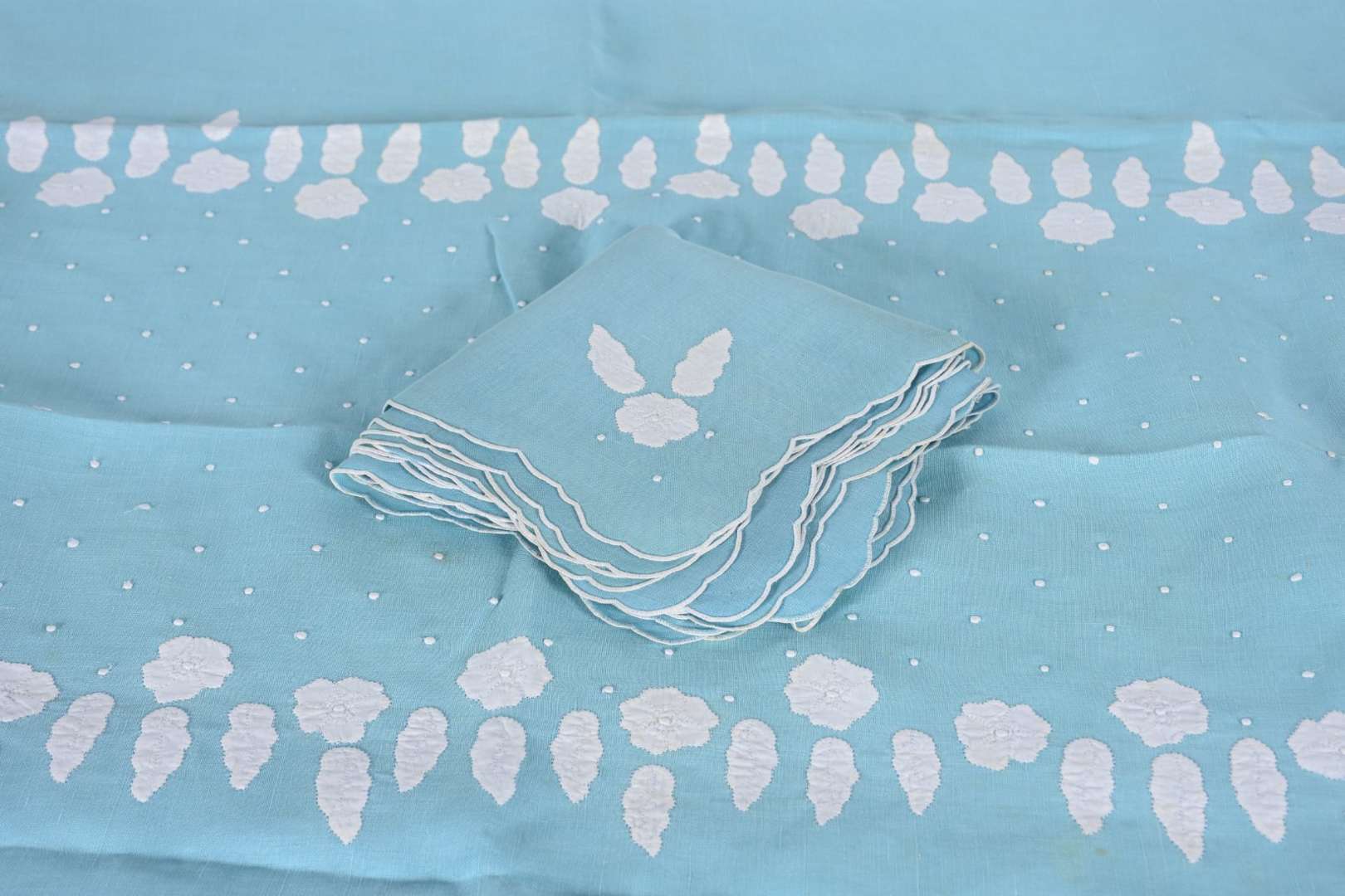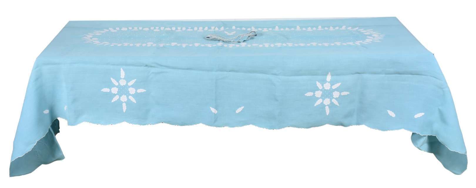 Toalha de mesa de linho azul com bordados, acompanham 12 guardanapos. Pequenas manchas de guardado.