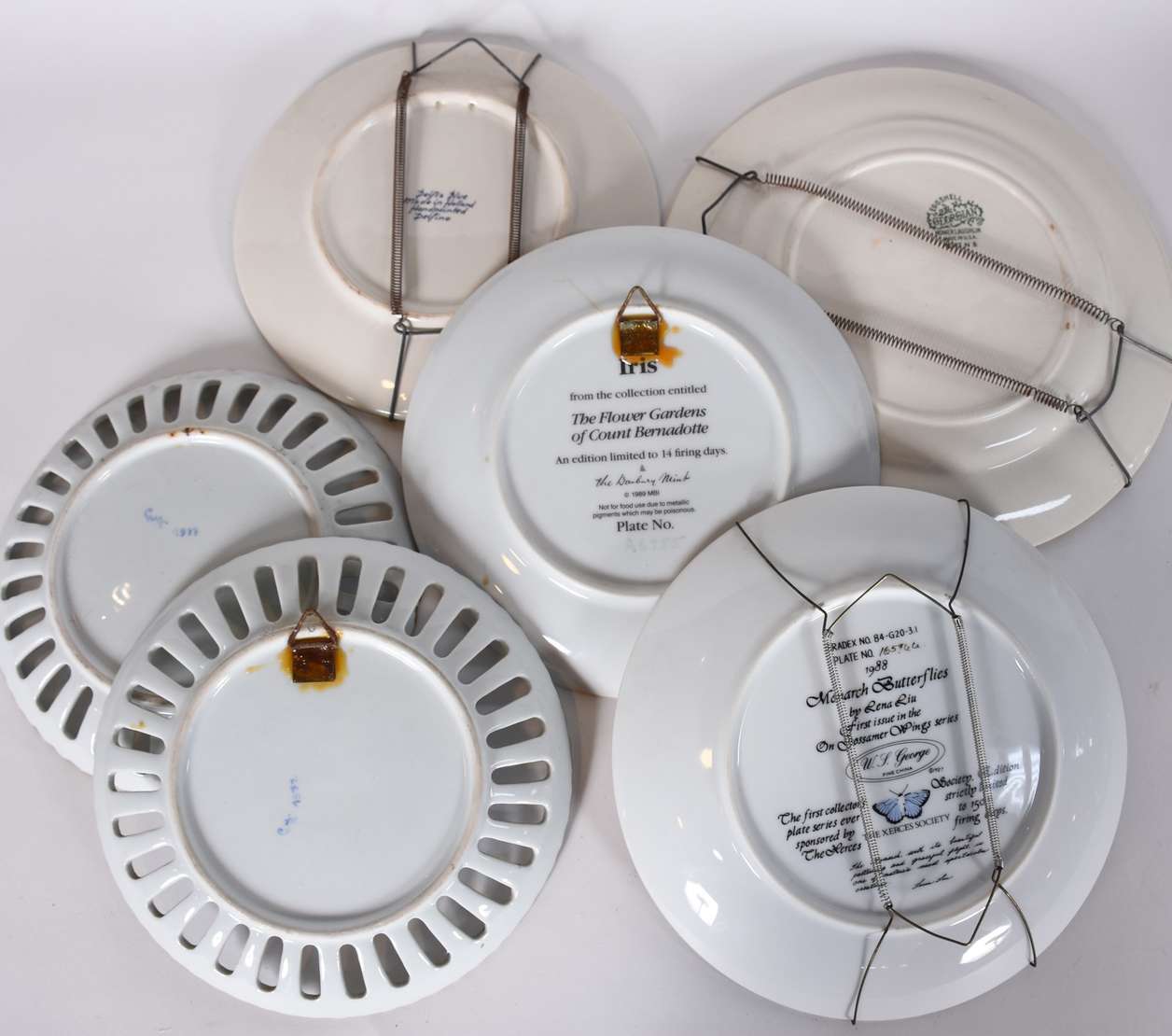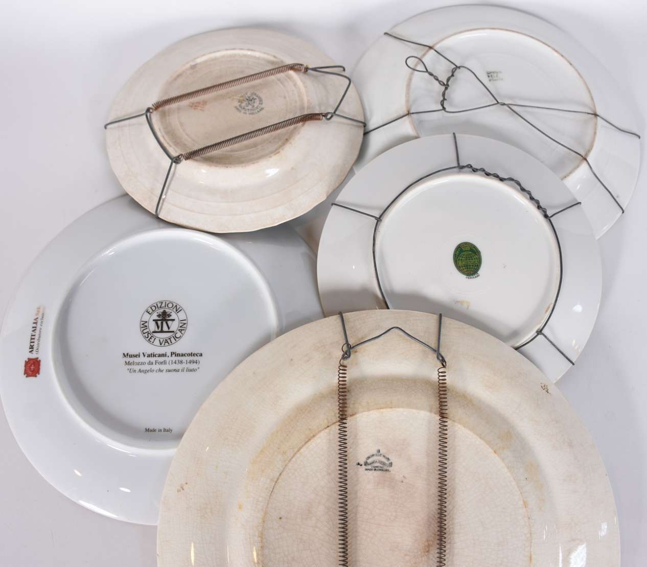 Oito bowls com cinco pratinhos de porcelana decorada com cenas românticas em policromia e borda com grega bordeaux. C...