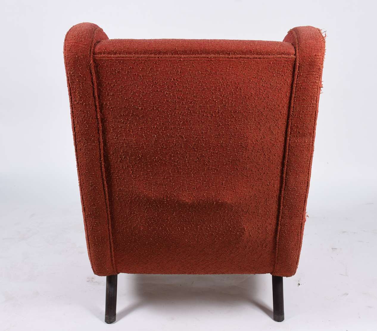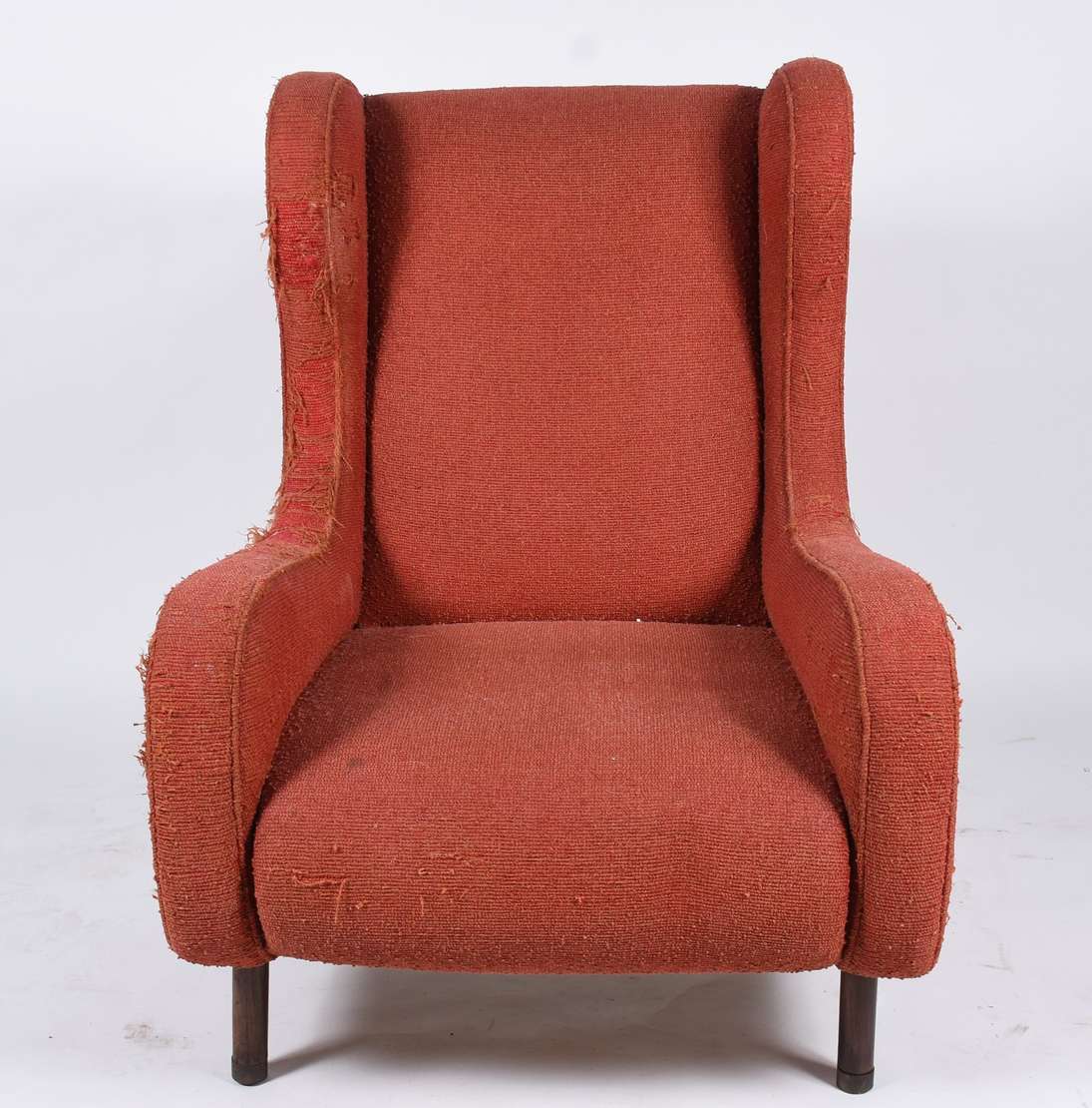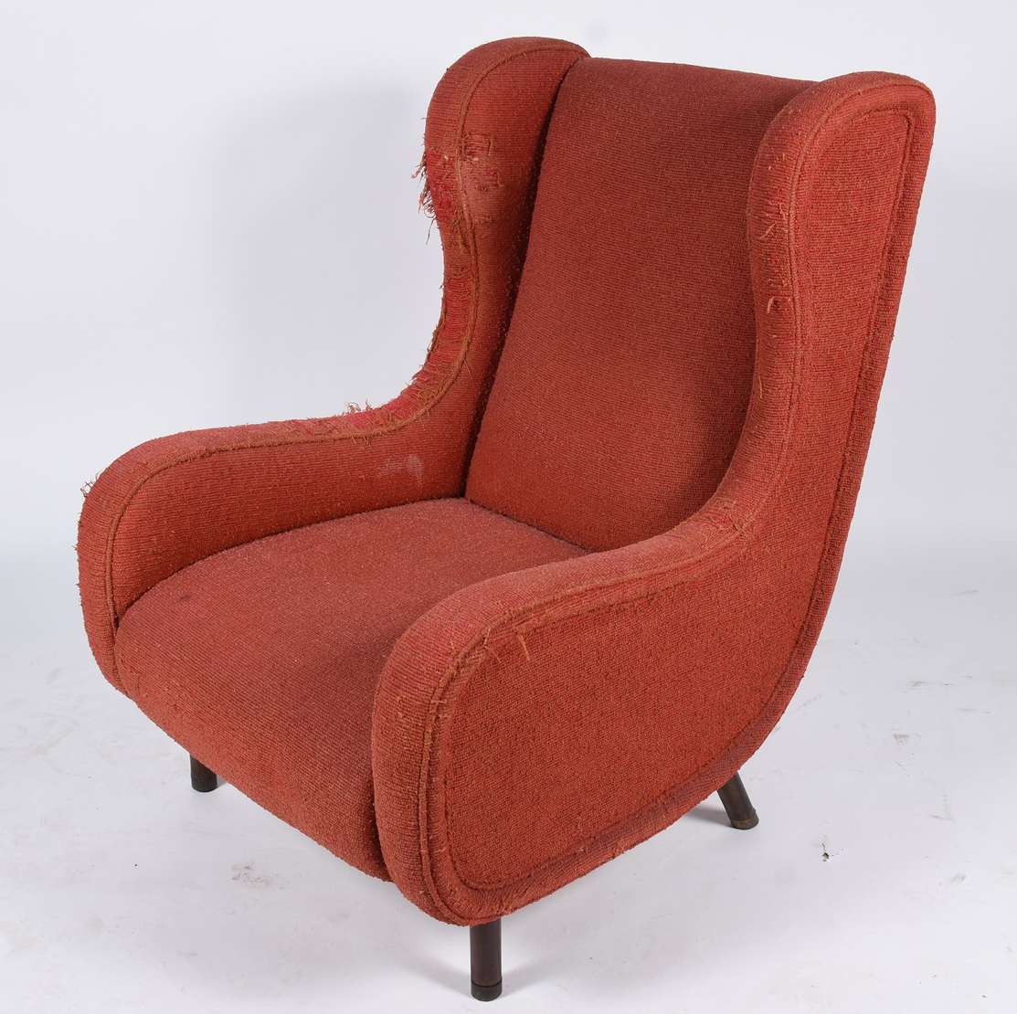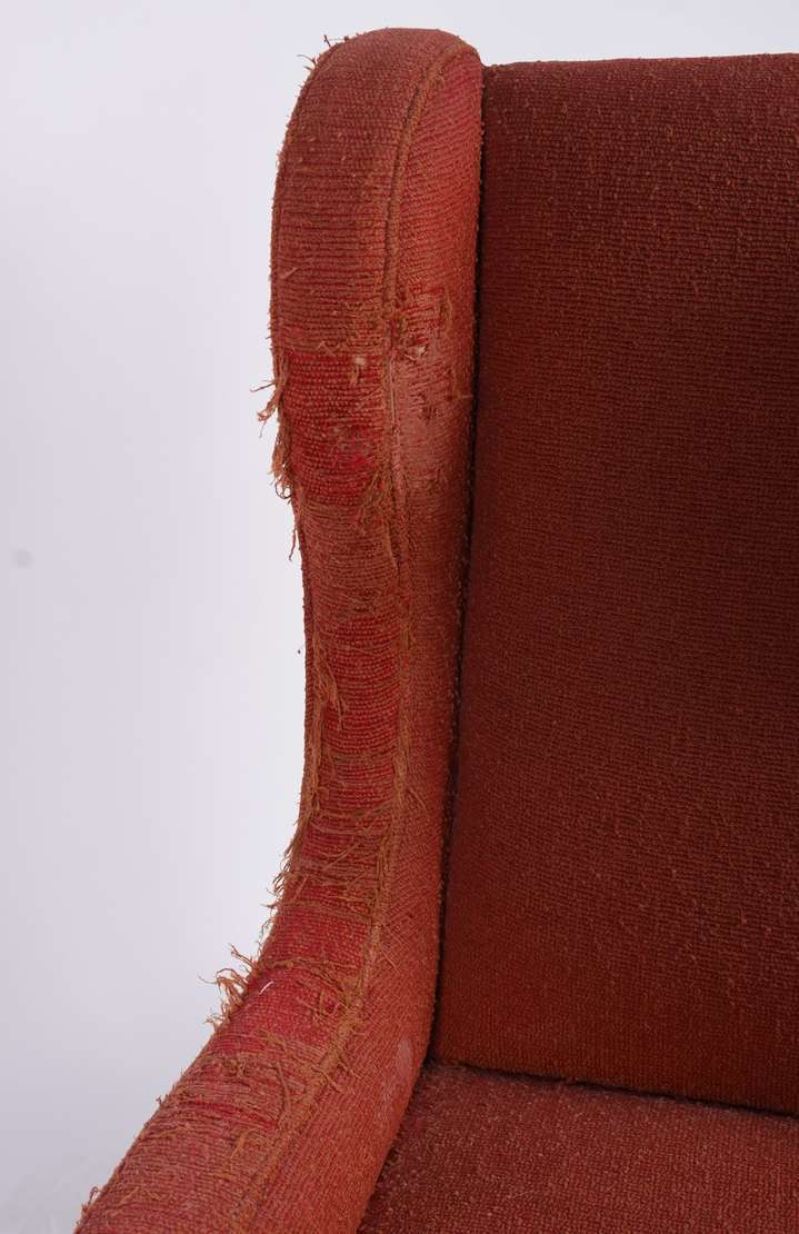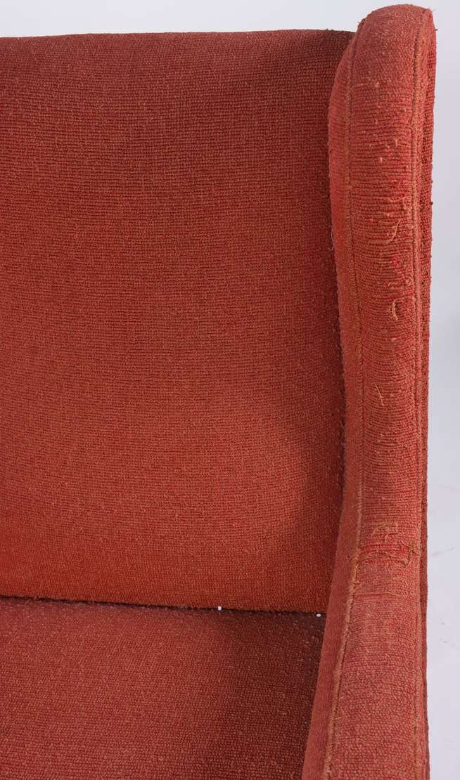 Poltrona bergere estofada e forrada com tecido na cor vermelha. Tecido com desgastes, anos 60.