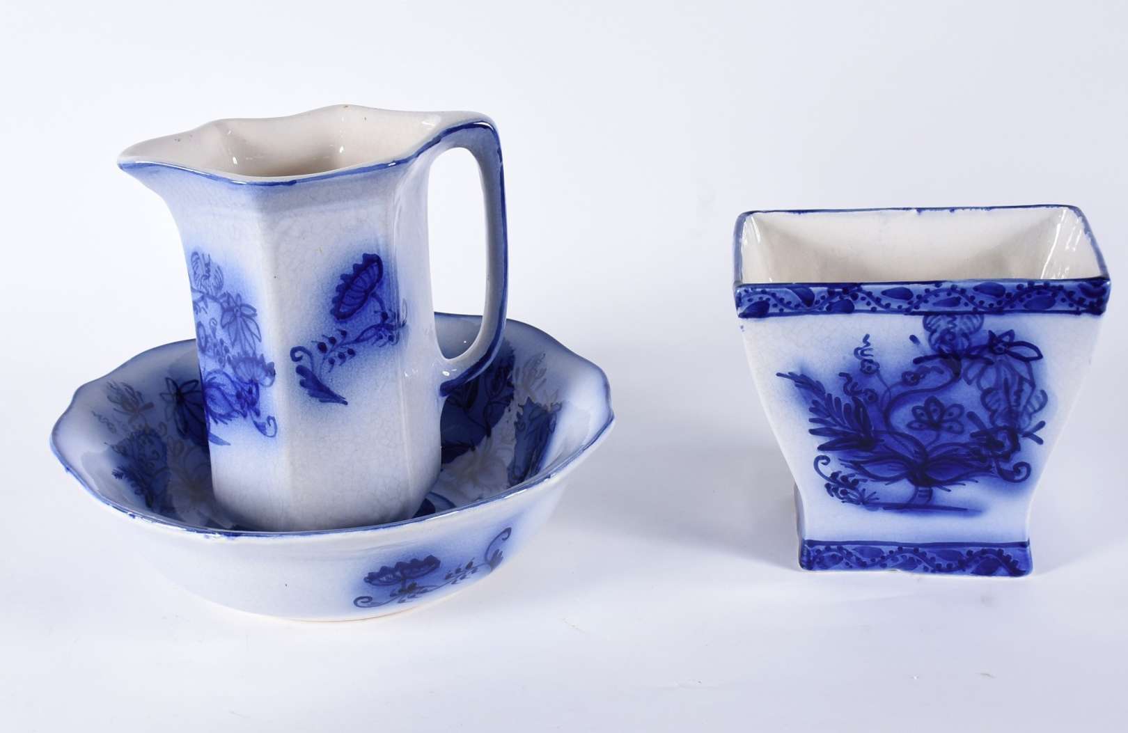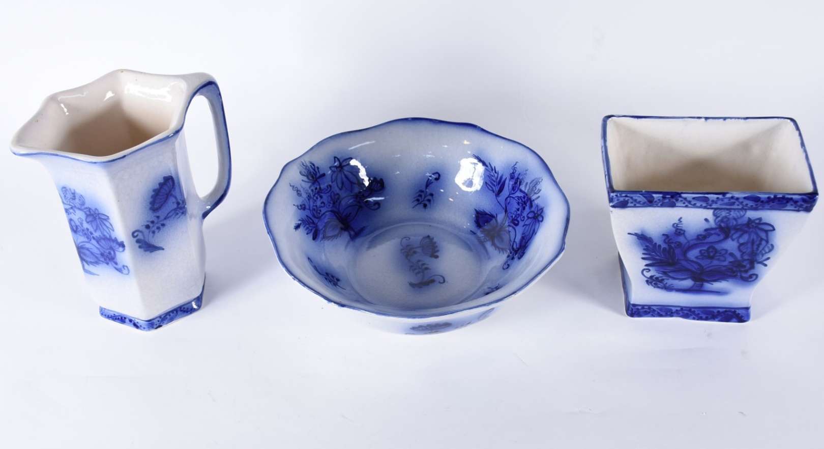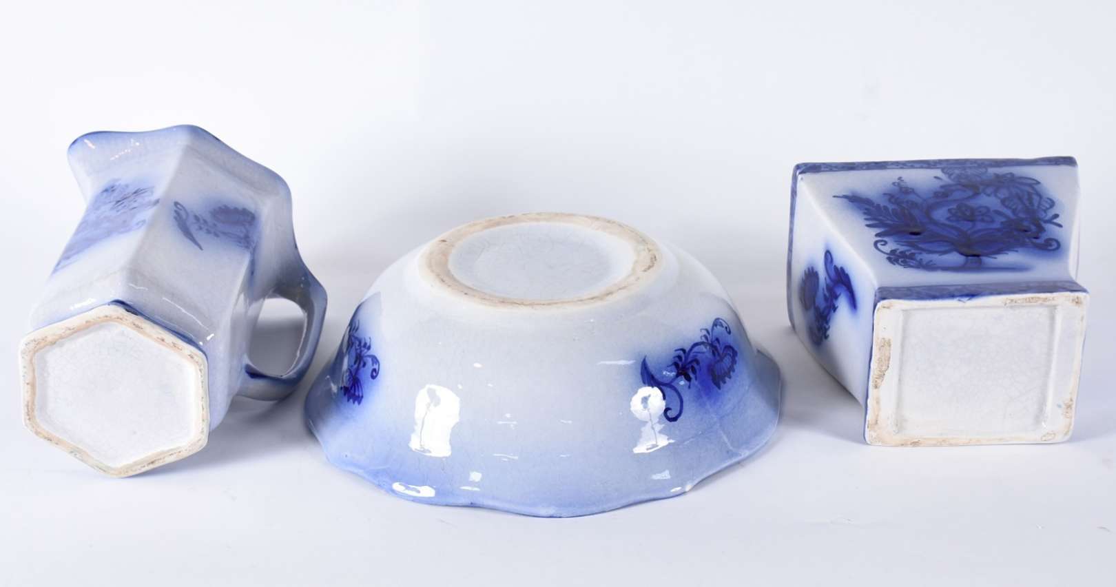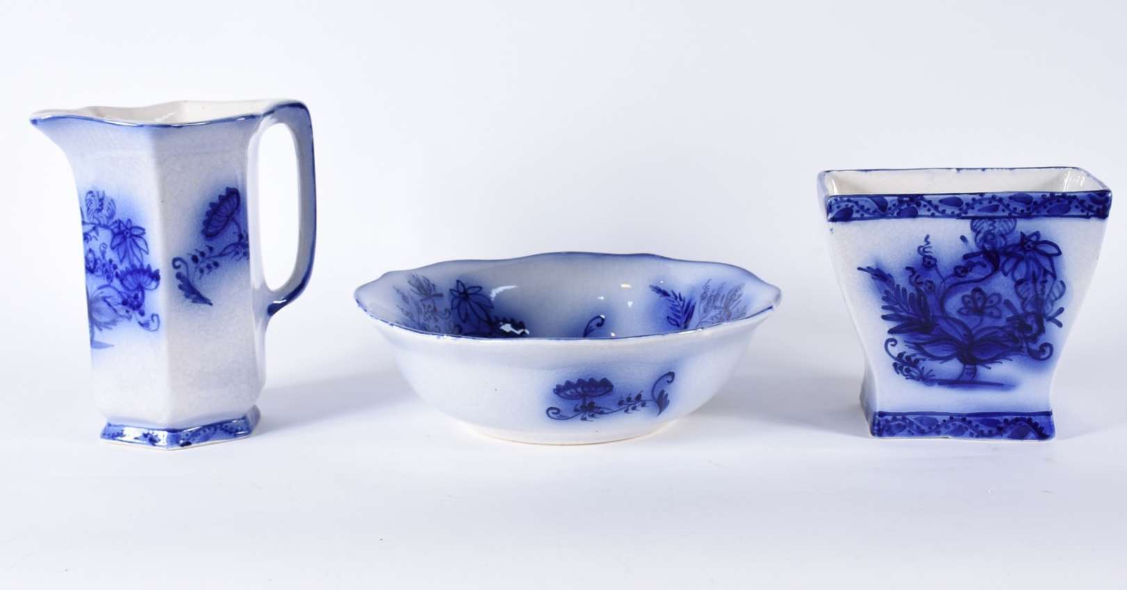 Três peças sendo bandeja e 2 galhetas de faiança azul e branca. Com craquelê e amarelados.