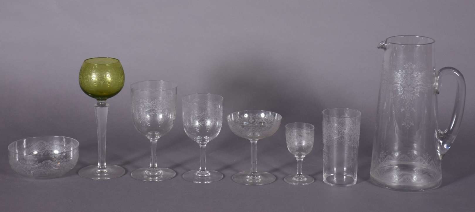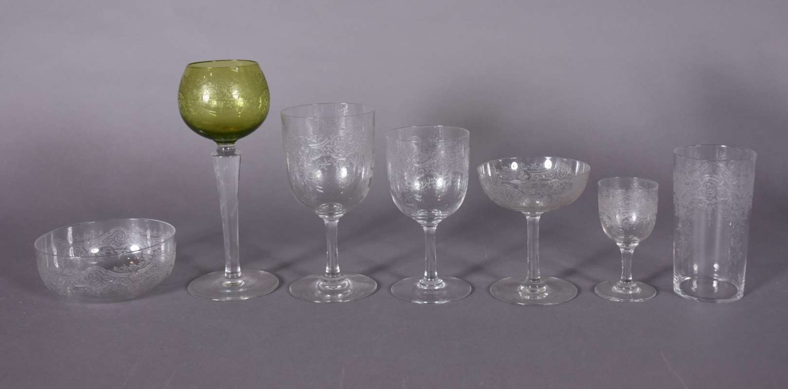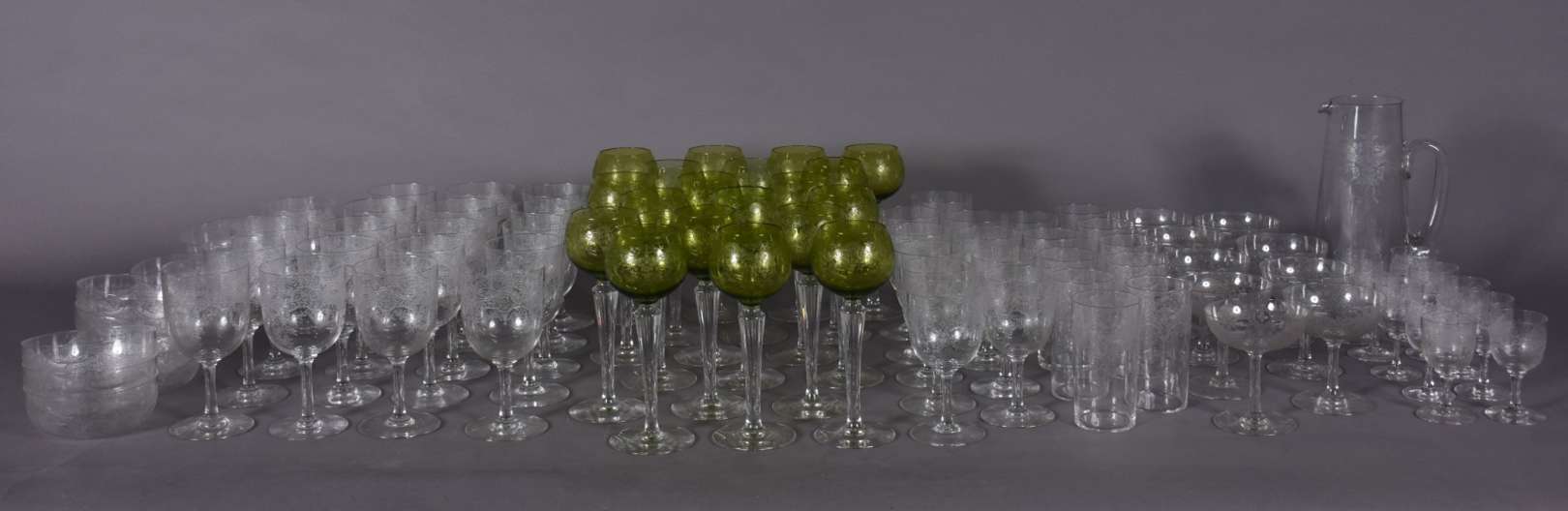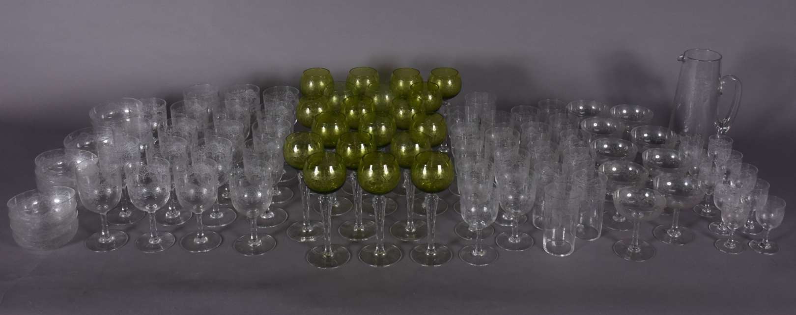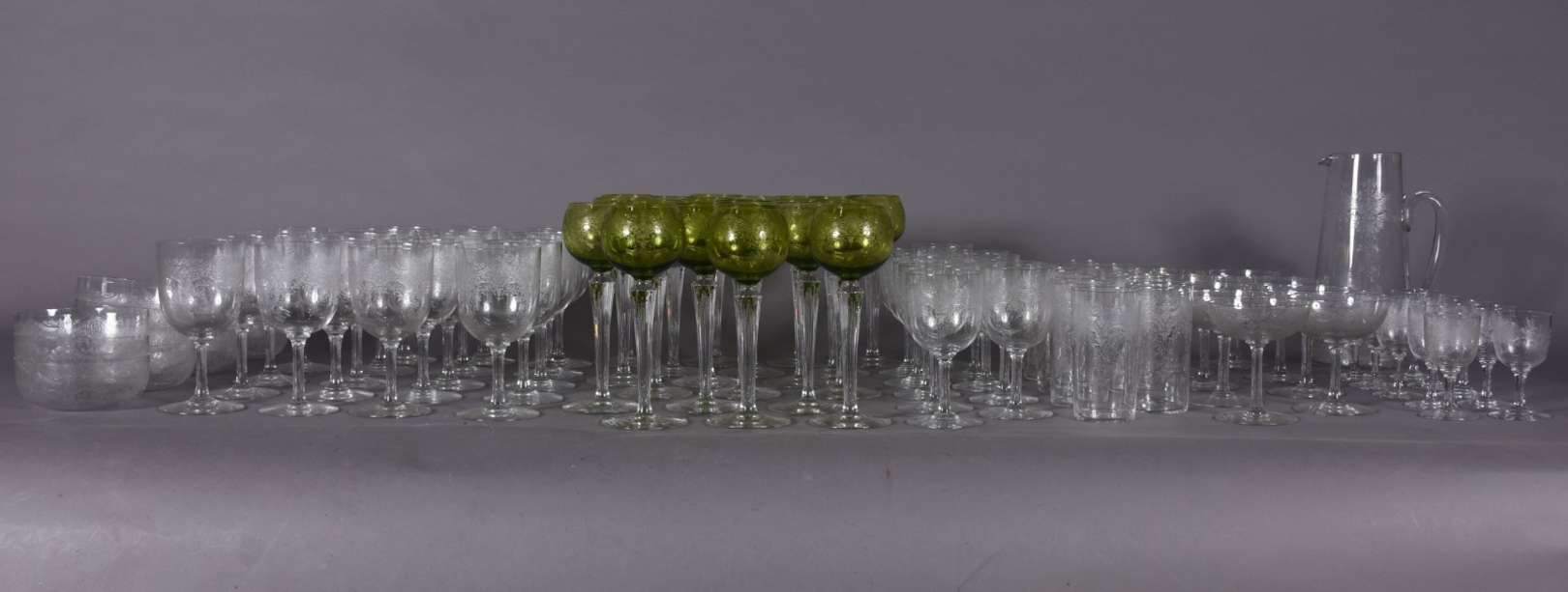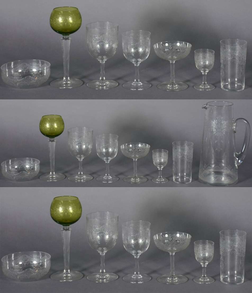 Serviço de taças de vidro lavrado com guirlandas, composto de: 11 taças para champagne, 4 para vinho branco, 10 vinho...