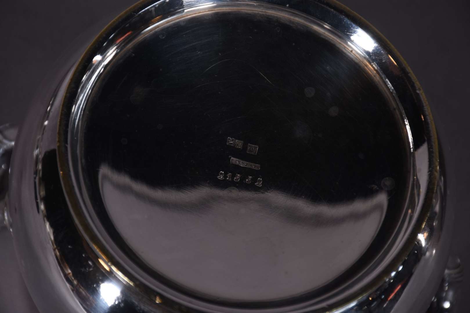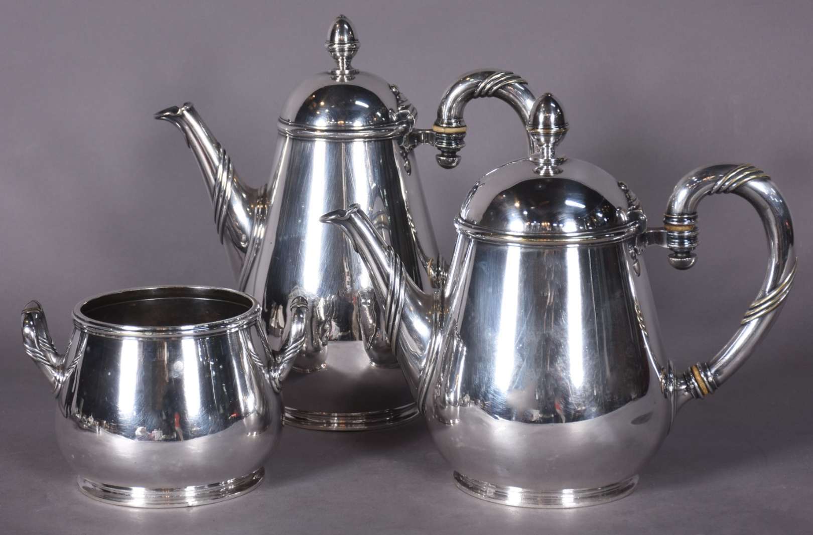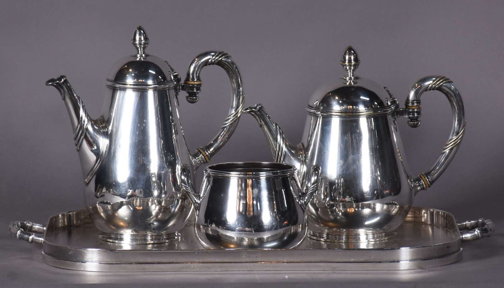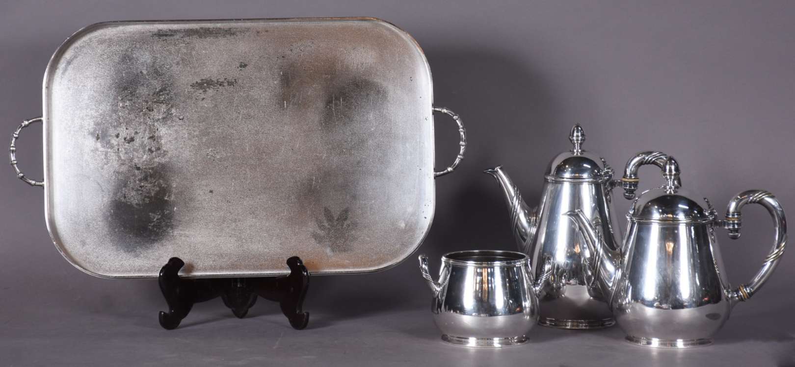 Baixela para chá e café de metal prateado Halphen, composto de: 2 bules, bandeja com alças e açucareiro. Total: 4 peças.