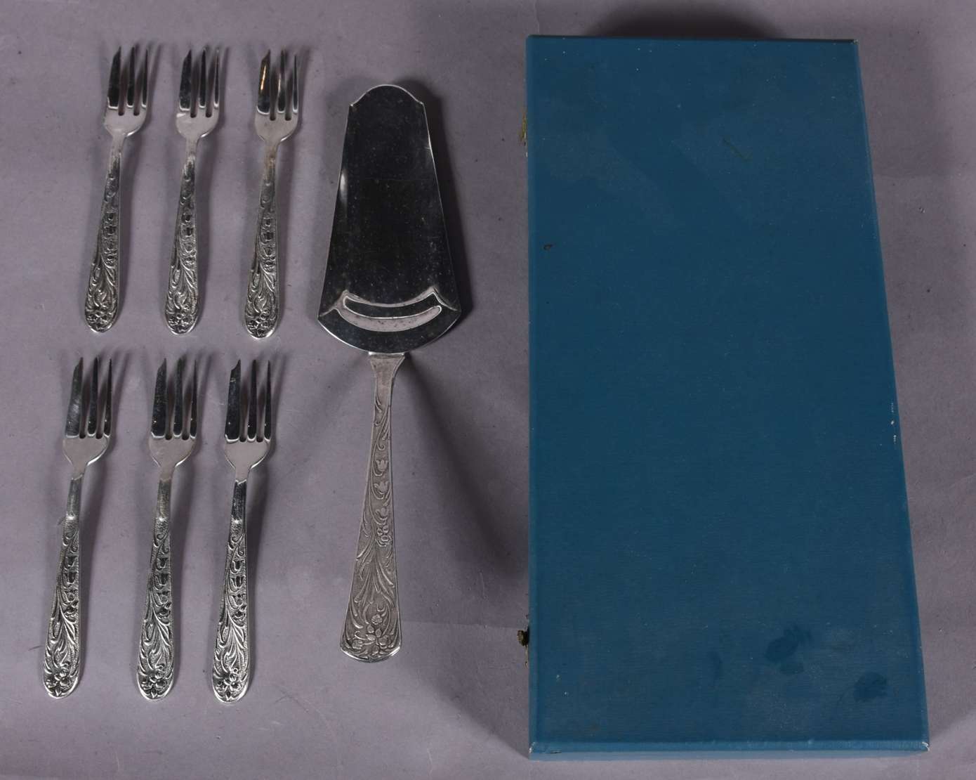 Conjunto com par de licoreiras, 4 cálices e presentoir (lascado nas bordas) de cristal azul com guirlandas douradas.