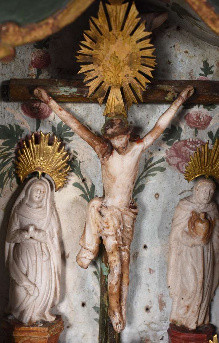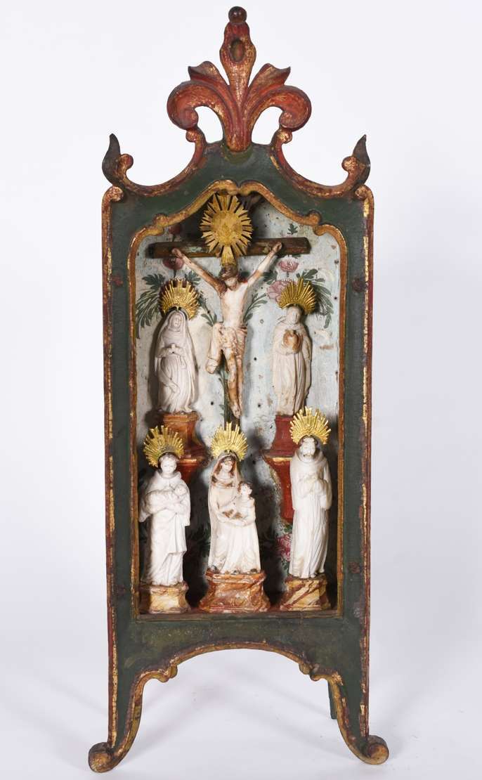 Crucifixo de madeira nobre com figura de Cristo ricamente entalhada.(Resplendor faltando partes, e metal com desgastes).
