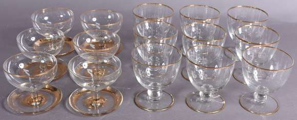 Diversas peças de vidro/cristal, sendo 9 taças com borda dourada e flor de liz lavrada e 6 taças de sobremesa acoplad...