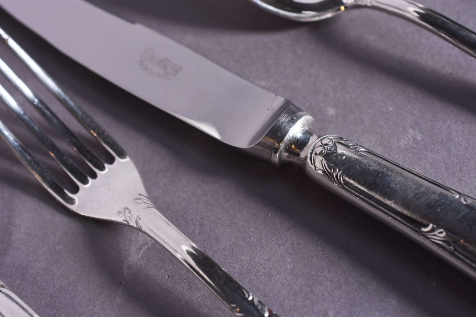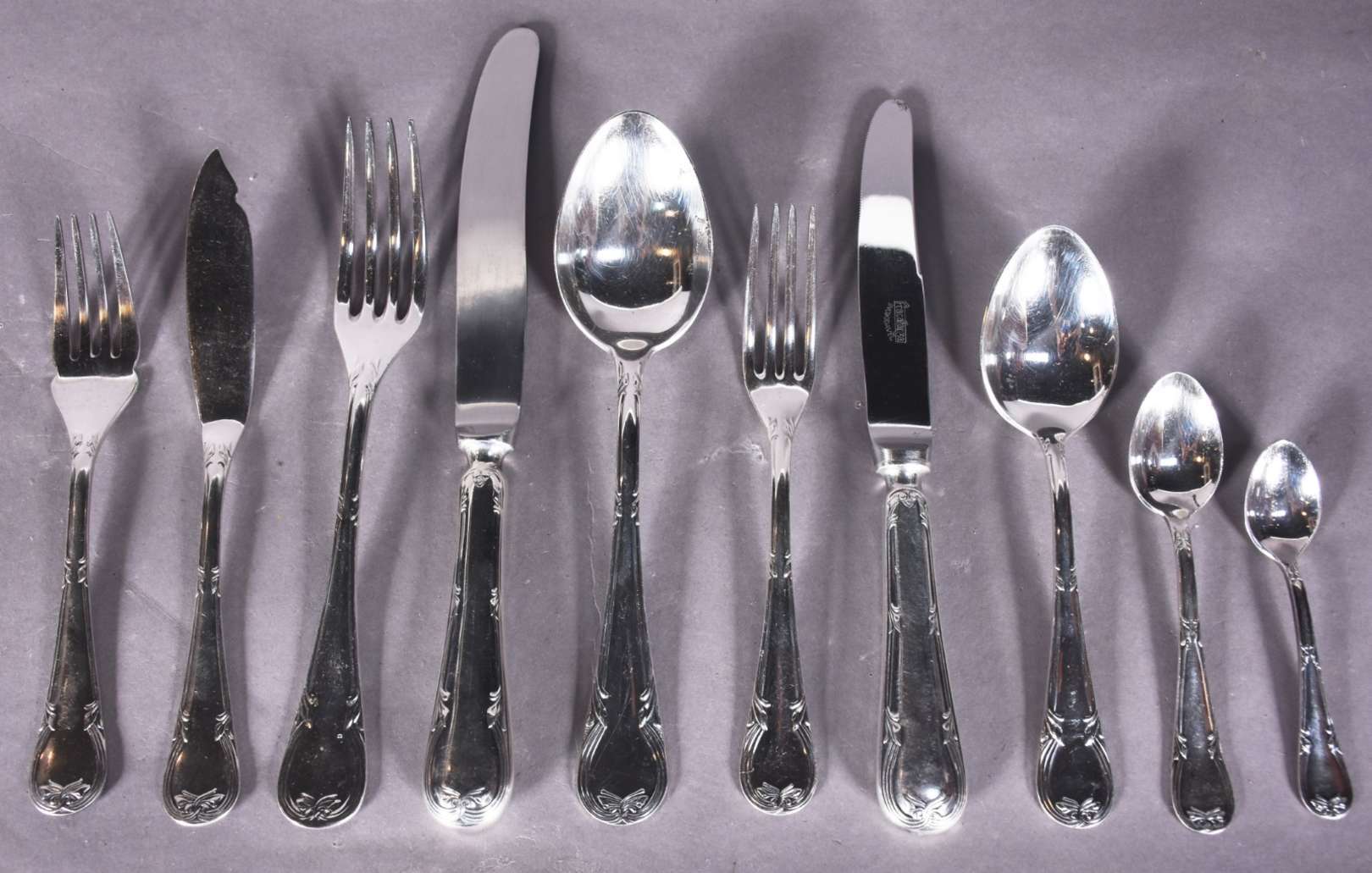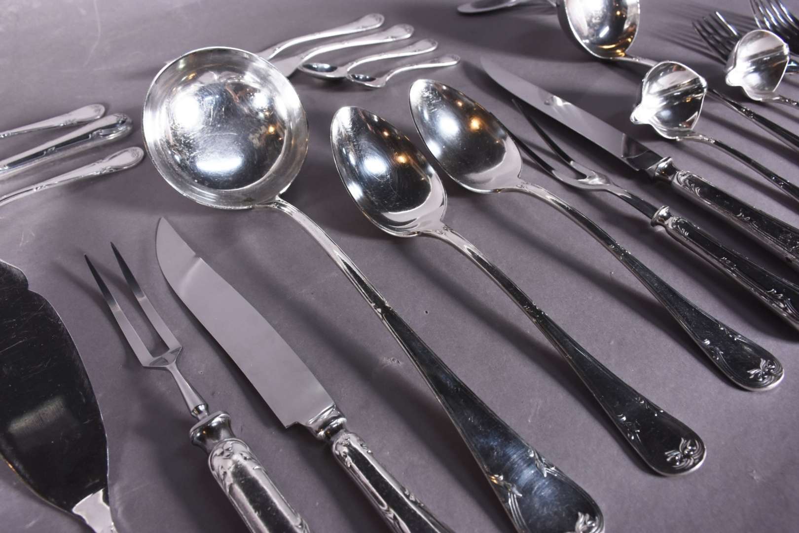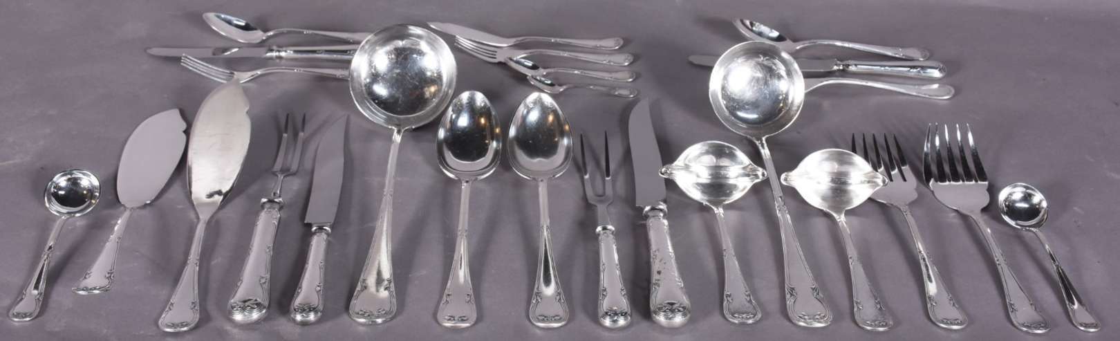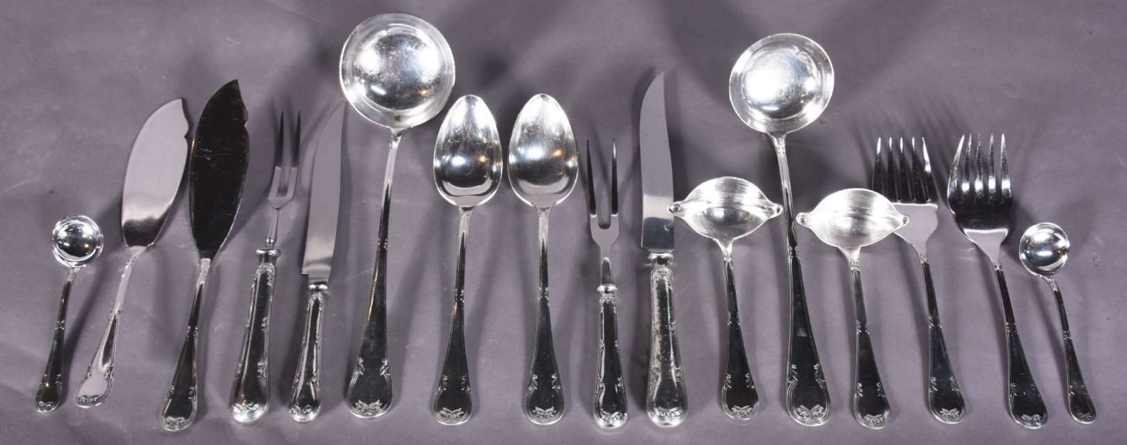 Faqueiro Fracalanza de metal prateado composto de: 24 garfos, 24 colheres, 24 facas grandes; 18 grafos, 24 colheres, 22 facas grandes; 33 garfos, 24 facas para peixe; 24 colheres para café; 24 colheres para chá e 15 peças de servir.