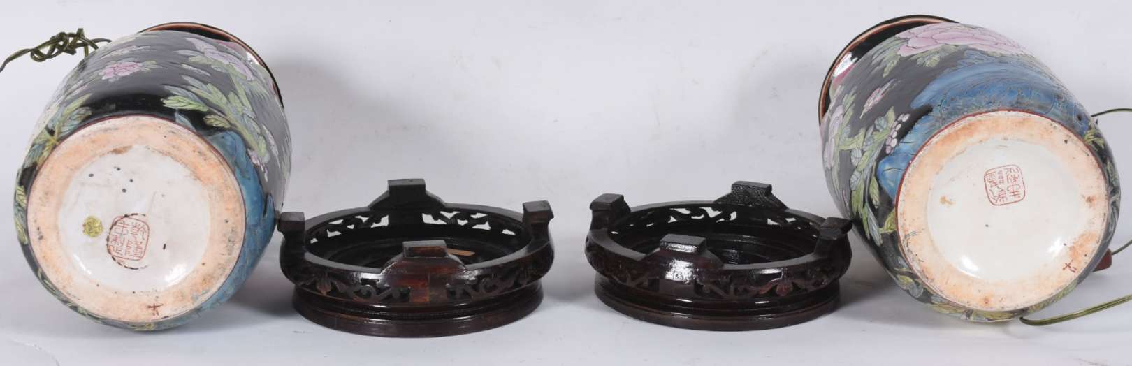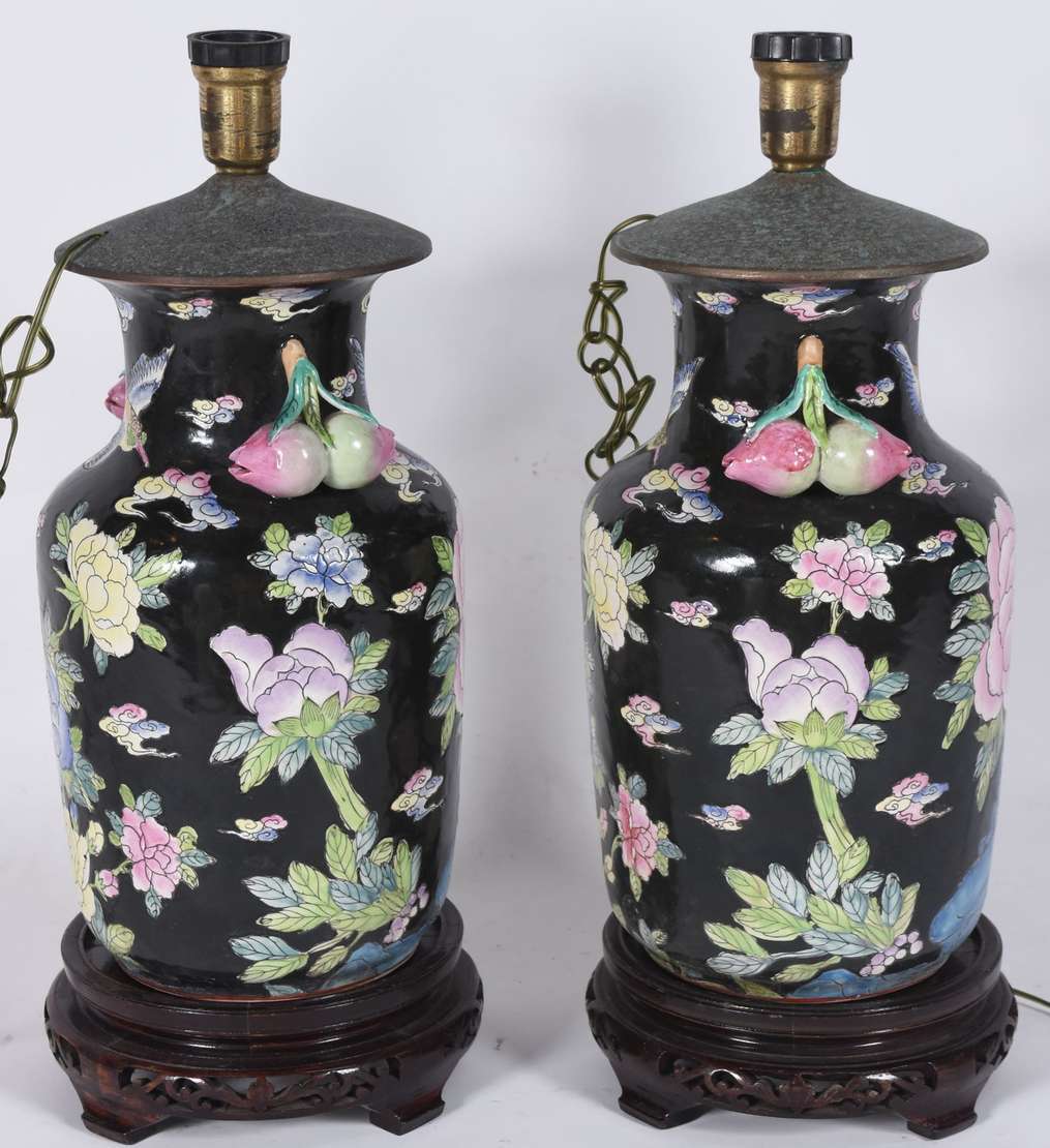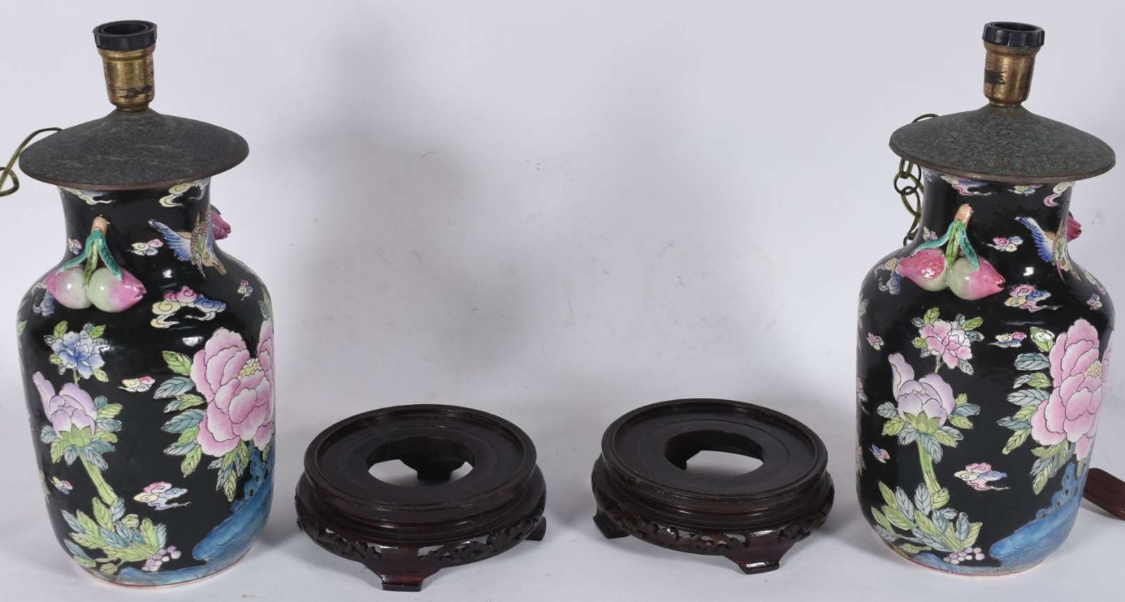 Par de abatjoures de porcelana possivelmente alemãs, decoração floral em policromia, bases de metal vazado. Acompanha...