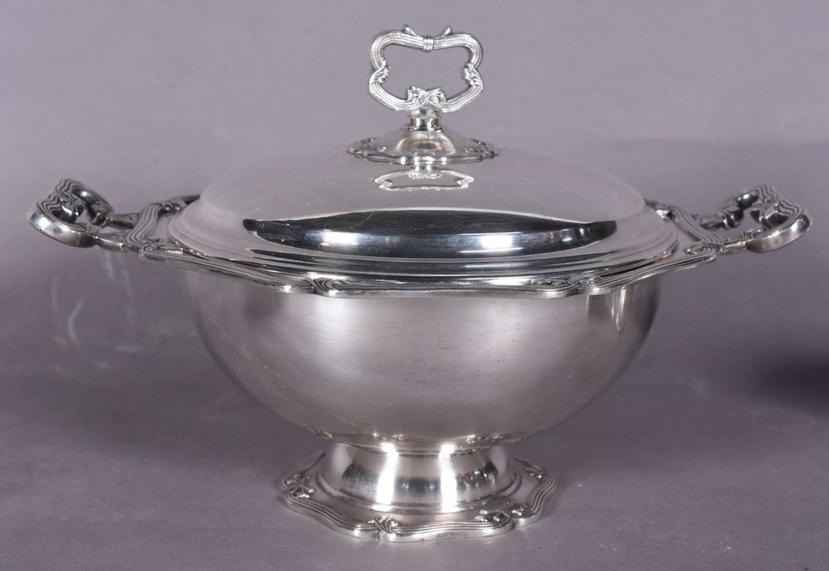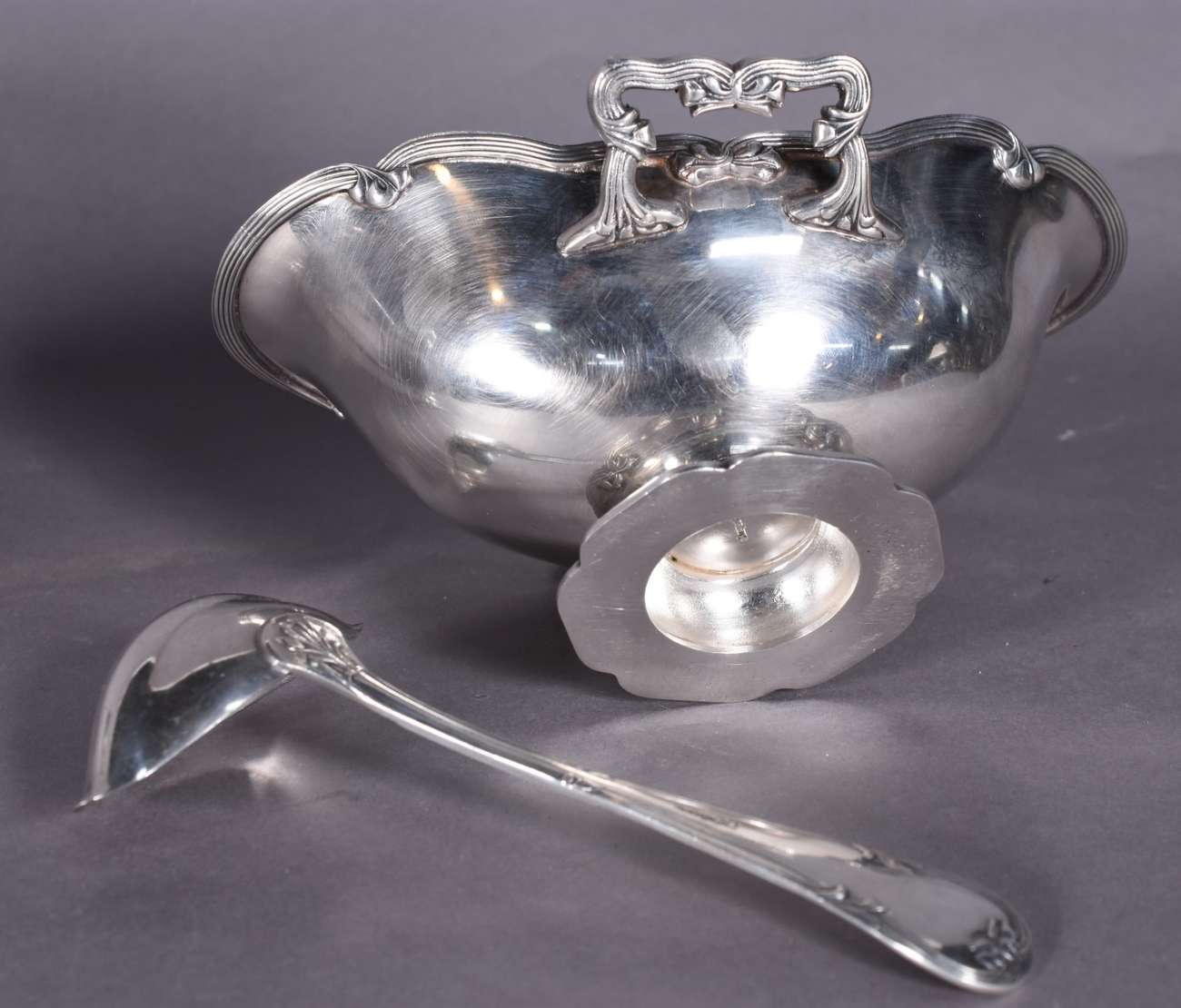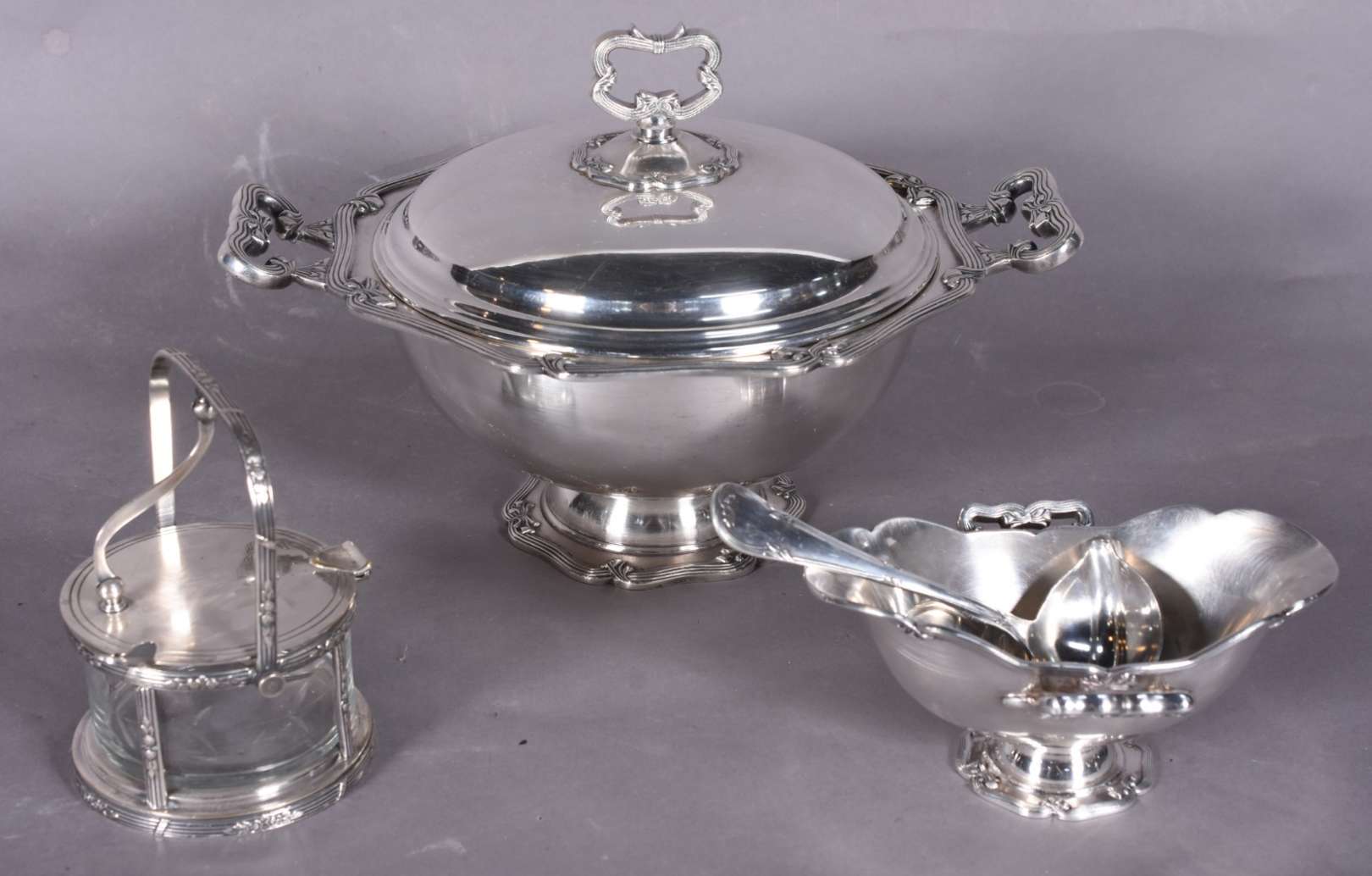 Três peças de metal prateado, sendo sopeira, molheira com concha e porta queijo com recipiente de vidro.