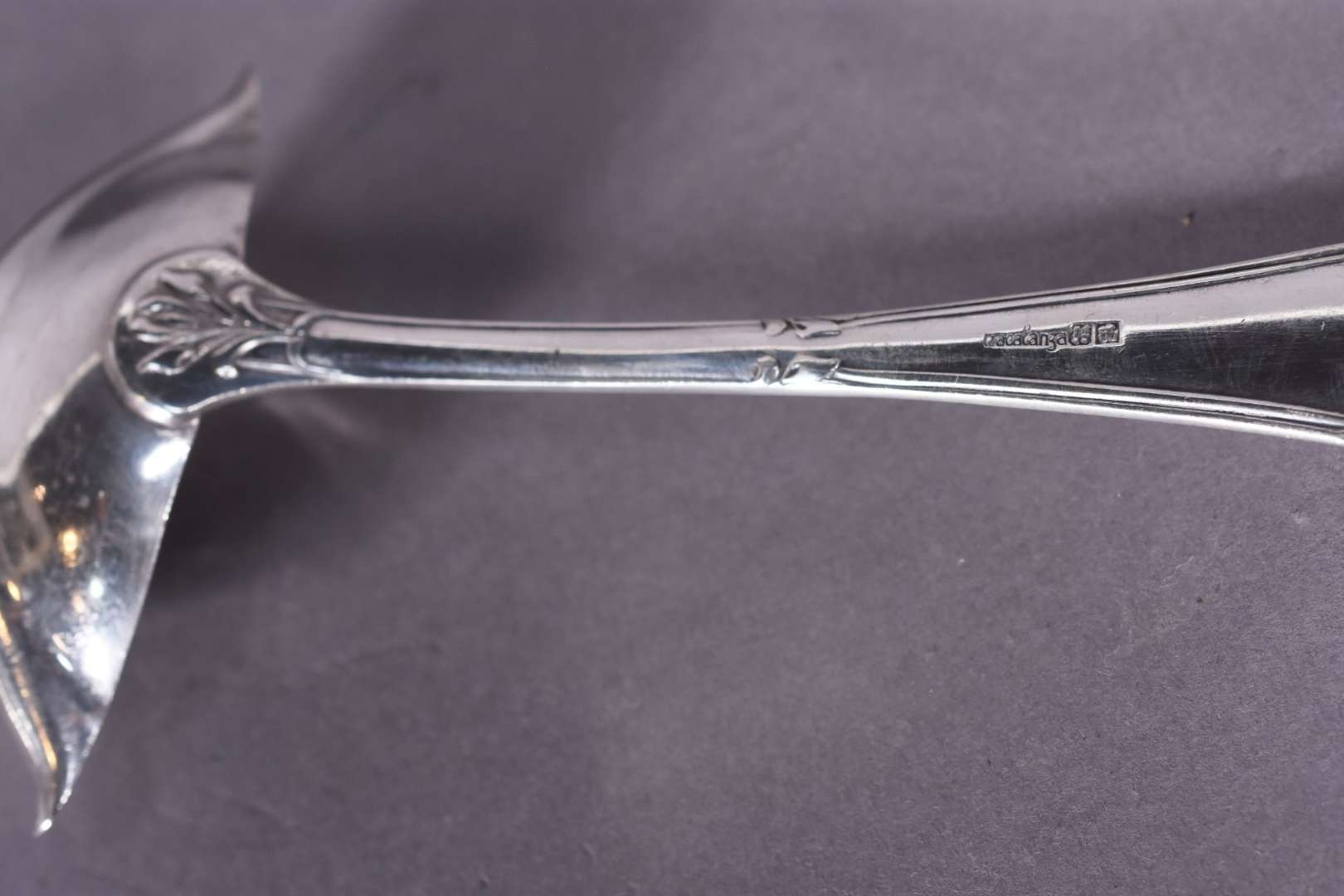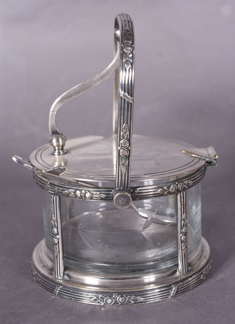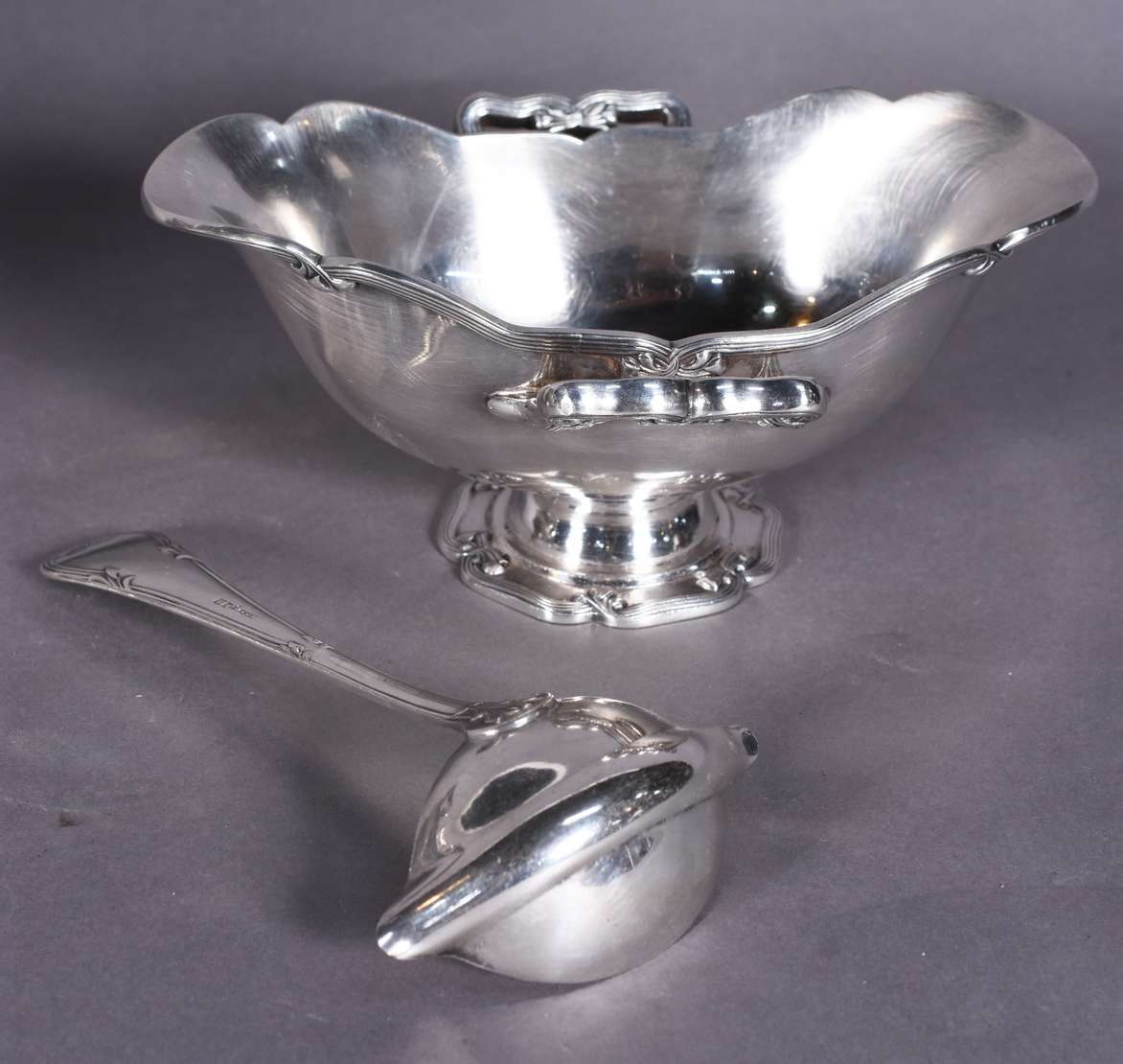 Três peças de metal prateado, sendo sopeira, molheira com concha e porta queijo com recipiente de vidro.