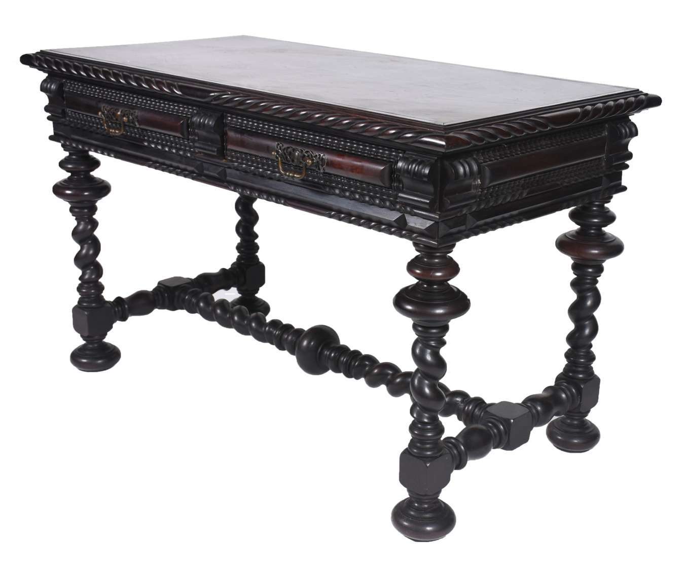 Aparador de madeira nobre com 2 gavetas, platô inferior, tampo de mármore e cercadura de metal.