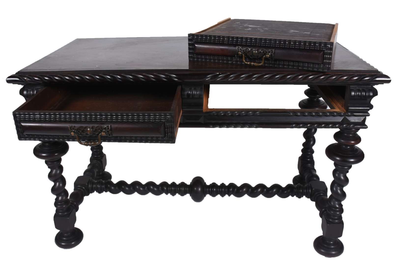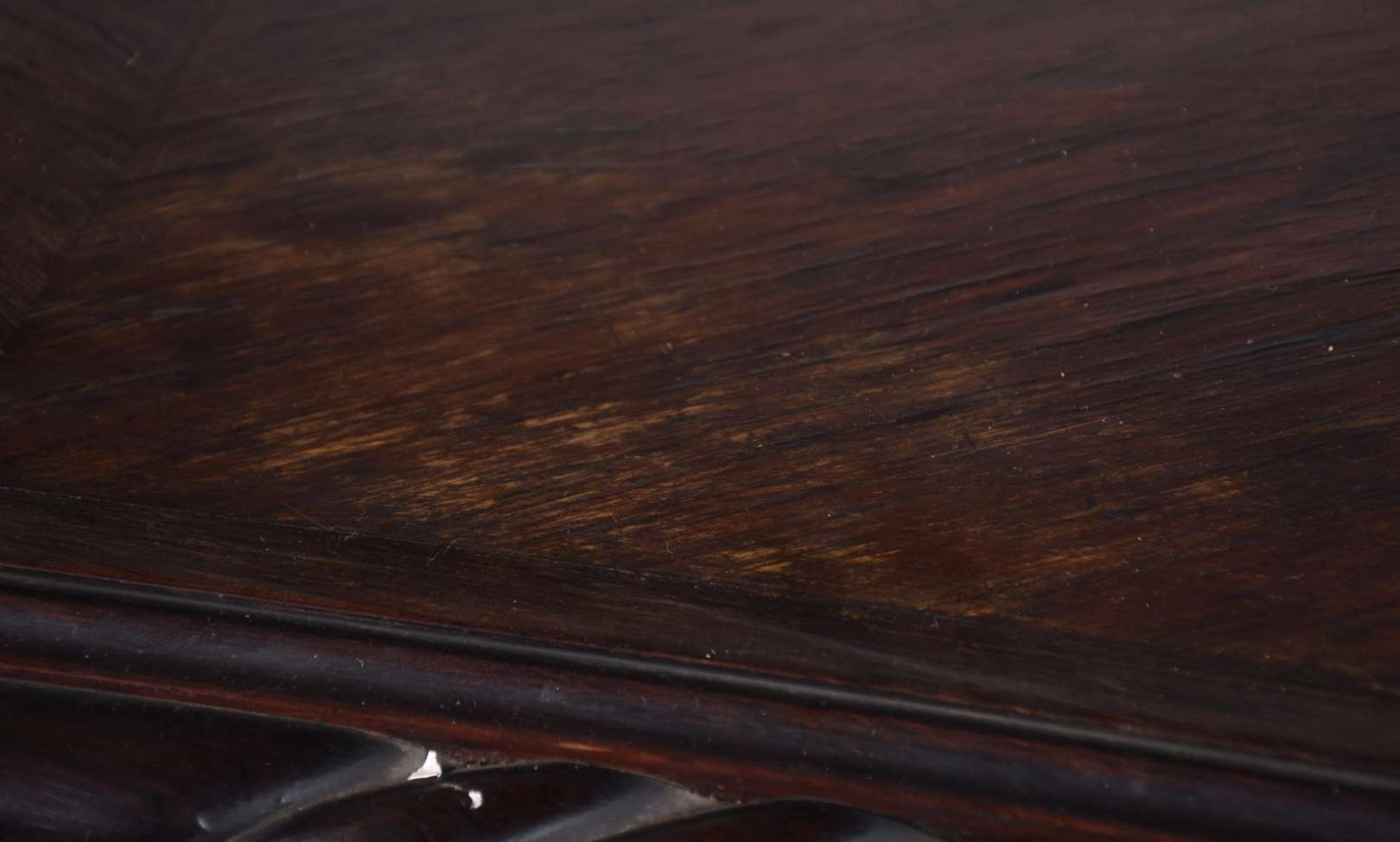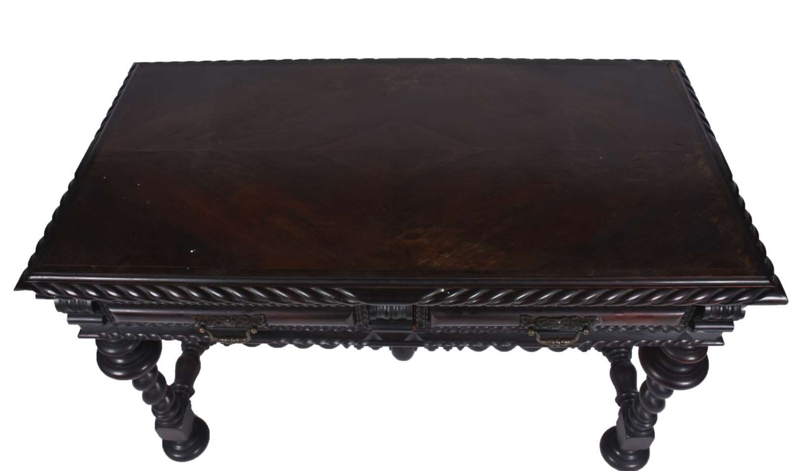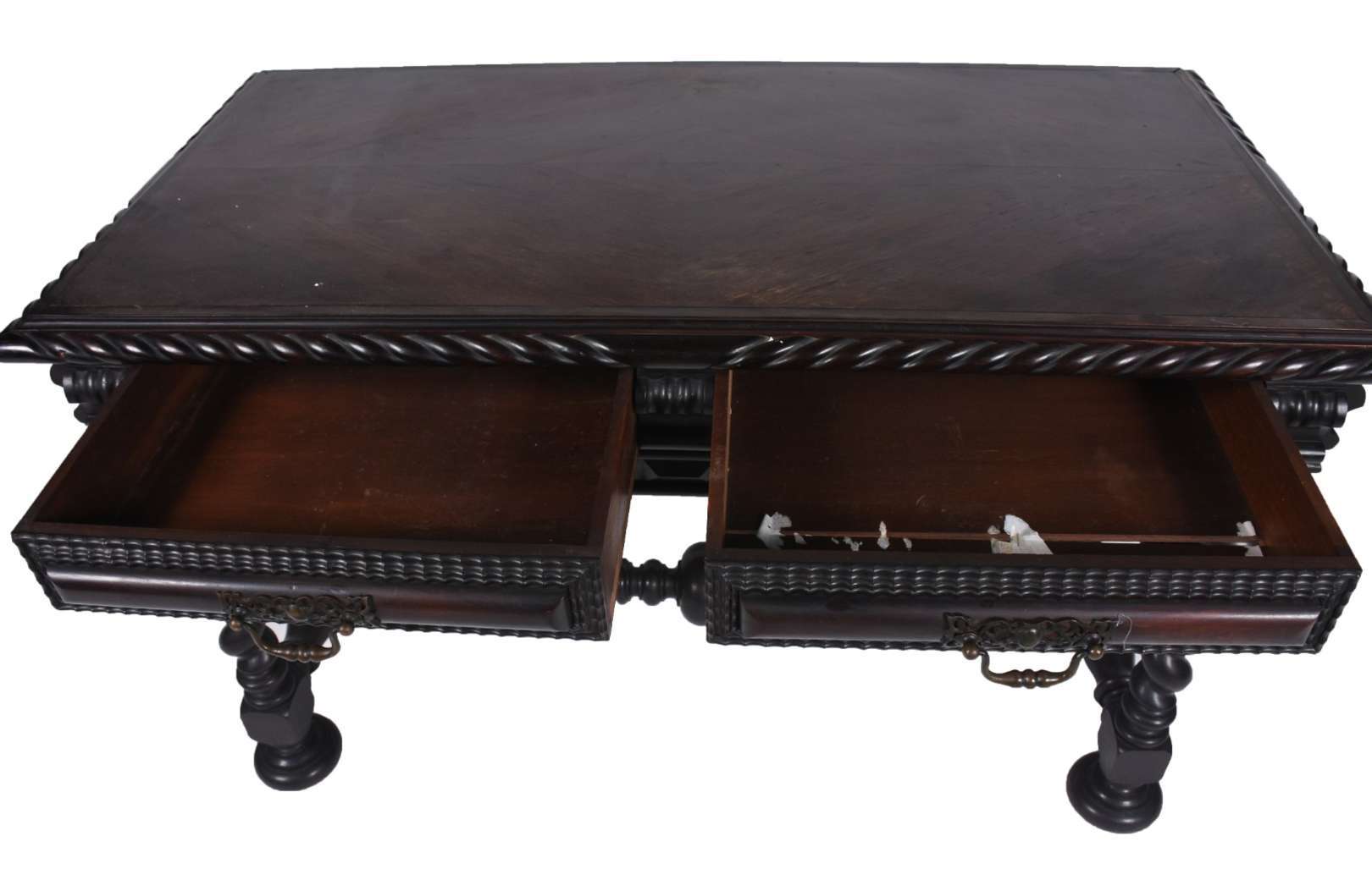 Mesa auxiliar de madeira nobre com 5 gavetas. Folheado do tampo soltando.