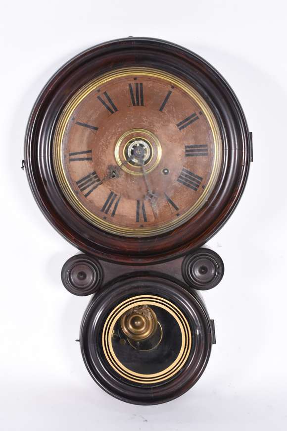 Relógio de parede com caixa de madeira feitio "oito". Mostrador com desgastes.