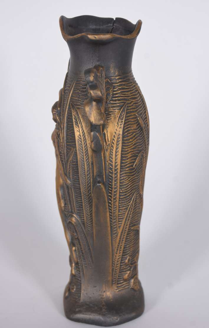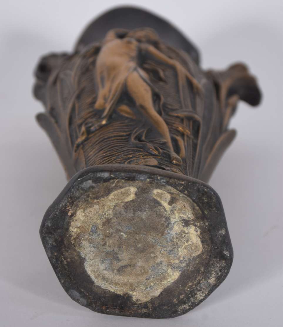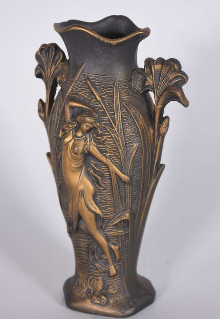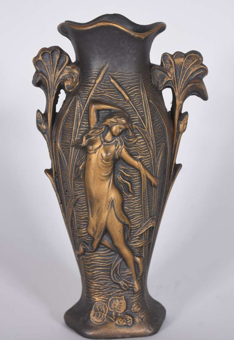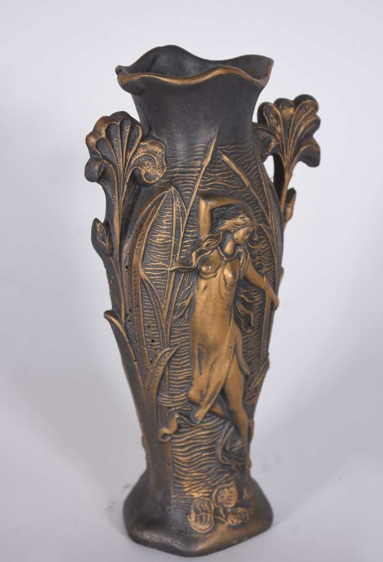 Vaso de bronze estilo Art Nouveau com figura feminina em relevo.