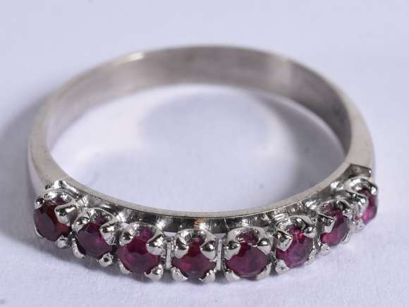 Anel de ouro branco cravejado com pedras vermelhos, aro 15 (Por motivos de segurança a peça não se encontra na loja)