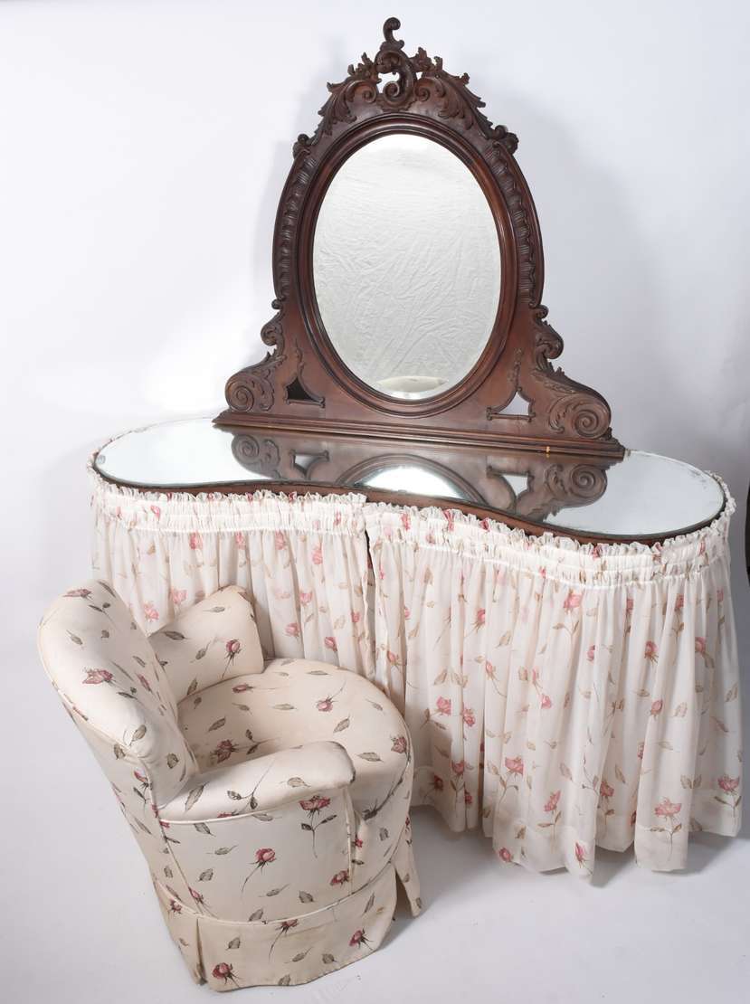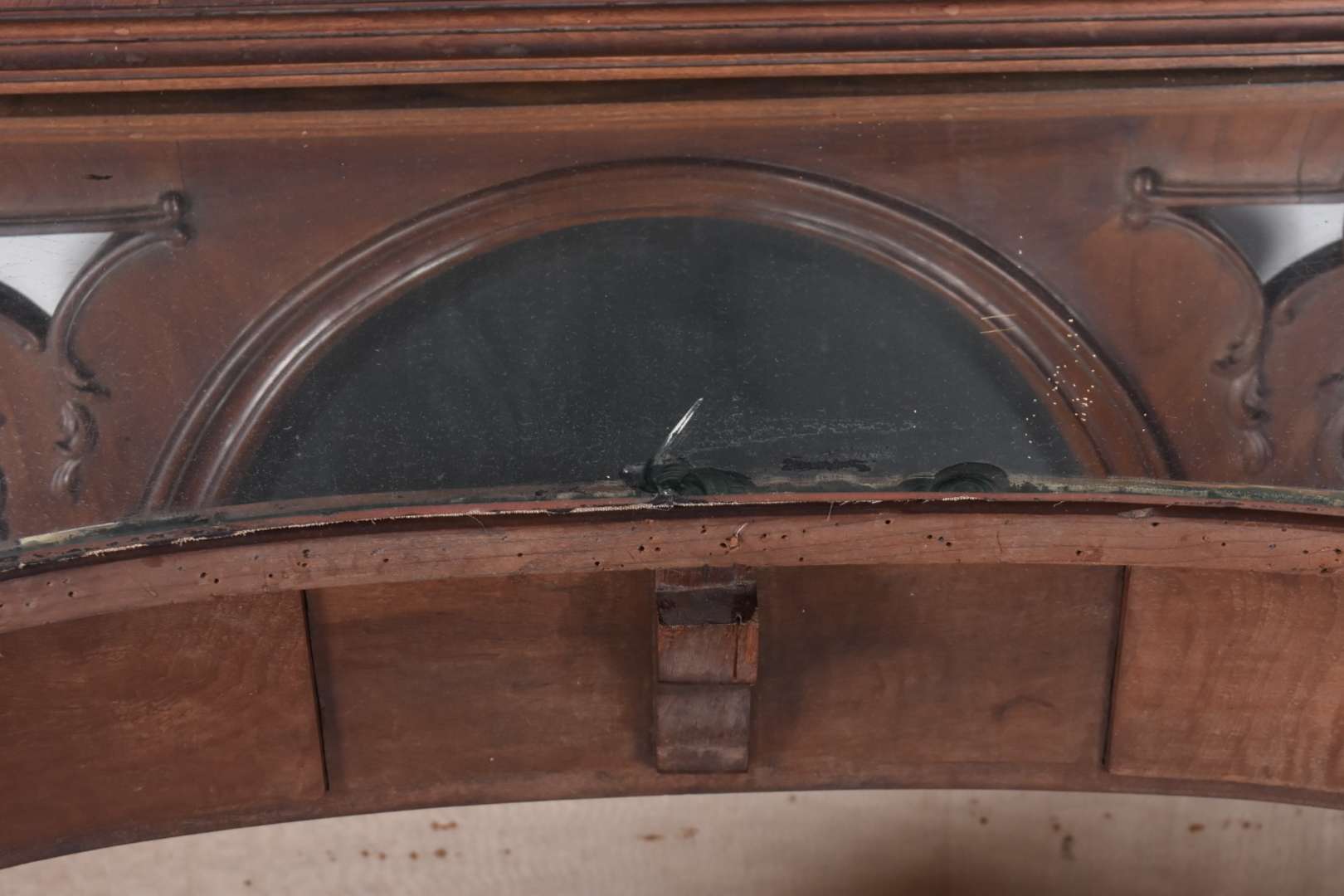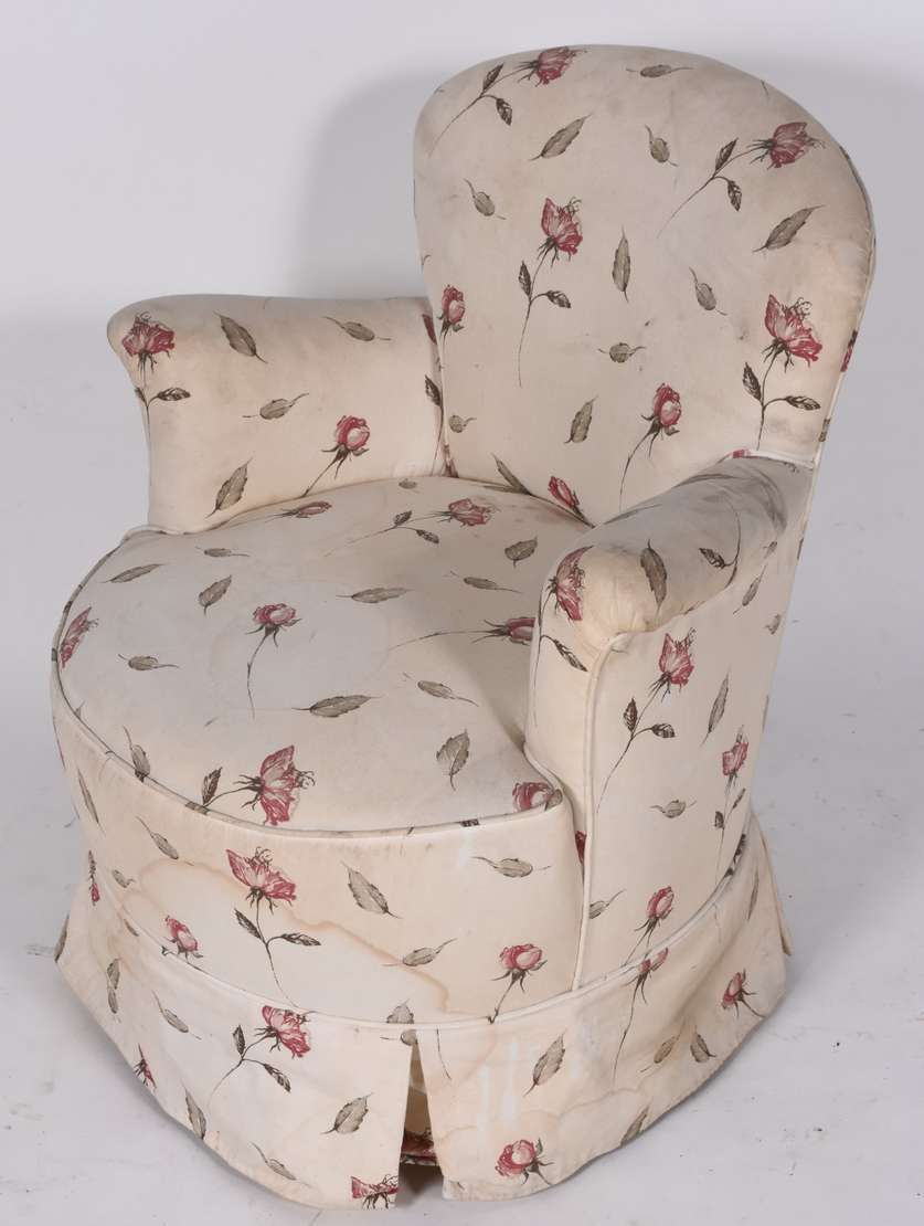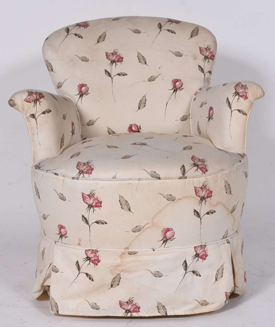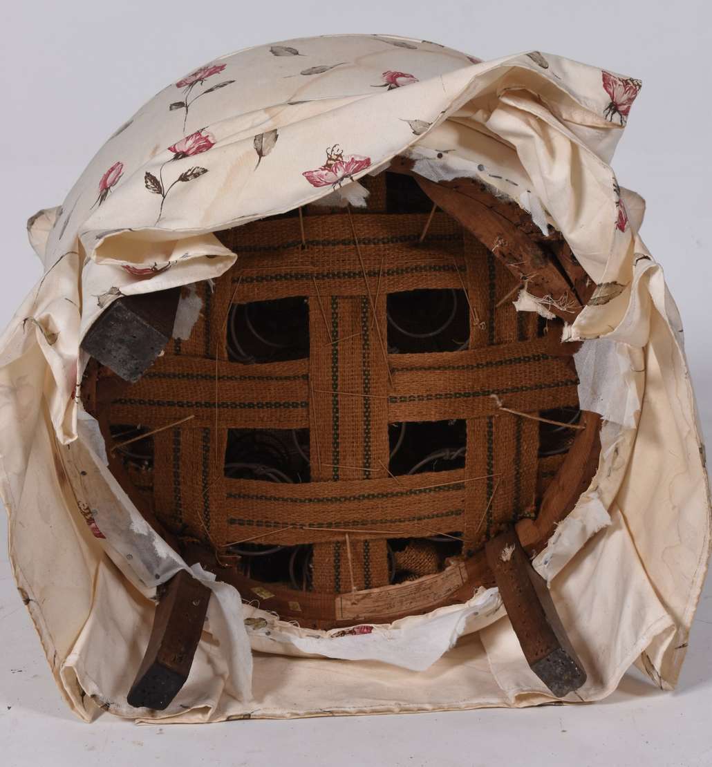 Cadeira singela de madeira nobre, detalhes entalhados, estofamento com tecido rasgado.