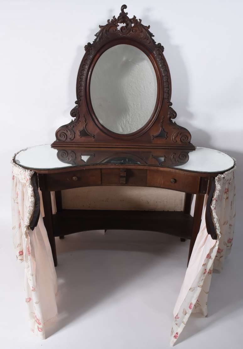 Mesa auxiliar de madeira nobre com 5 gavetas. Folheado do tampo soltando.