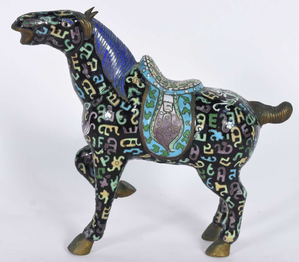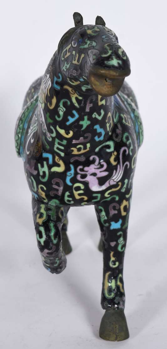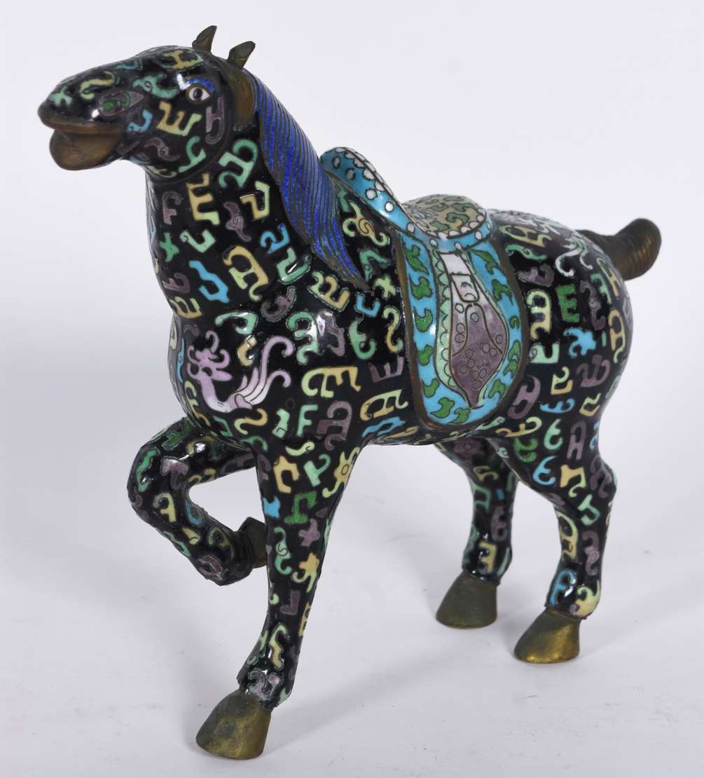 Duas esculturas de petit bronze, uma delas representando cavalo com base de madeira, e a outra, figura feminina com b...