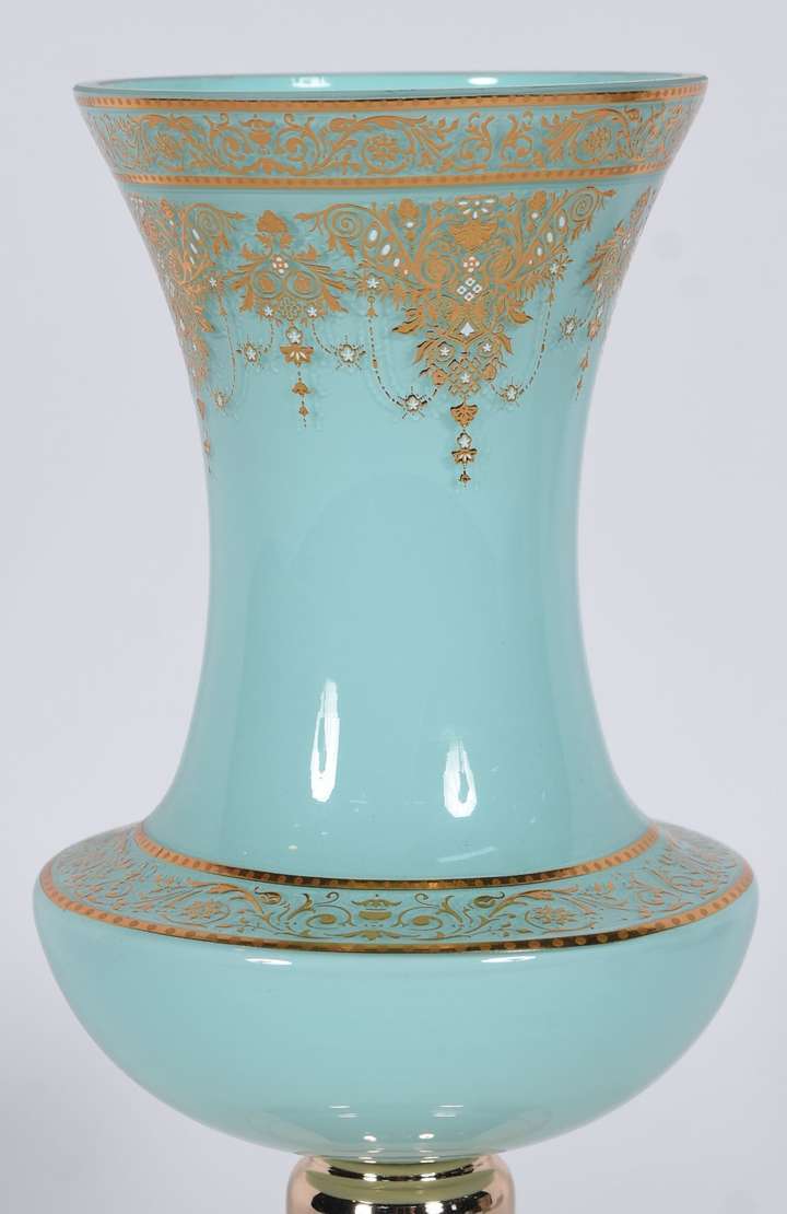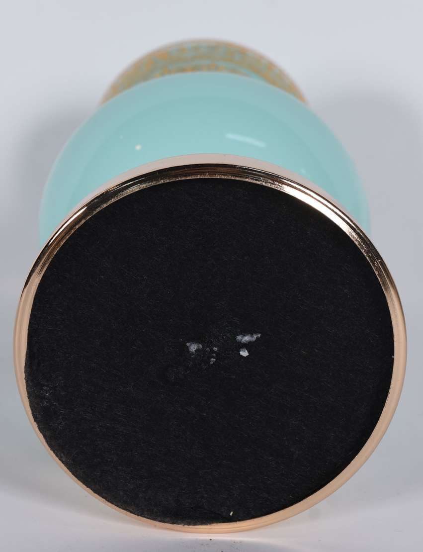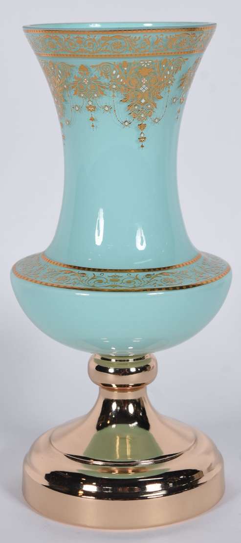 Vaso de vidro decorativo na cor verde, base e desenhos dourados.