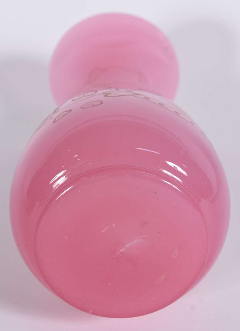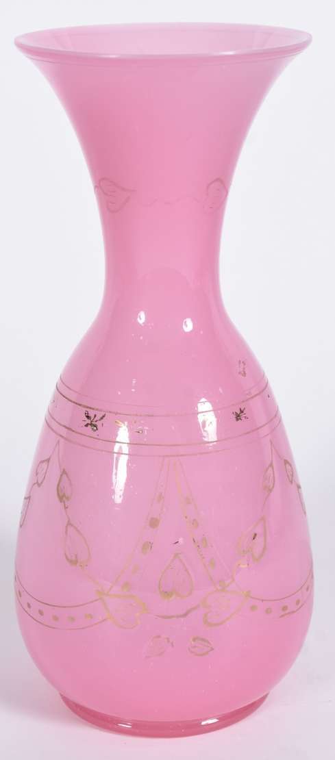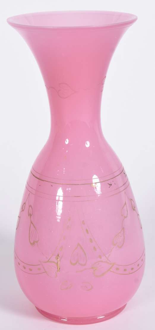 Vaso de opalina verde, decoração floral em policromia, borda feitio babado.
