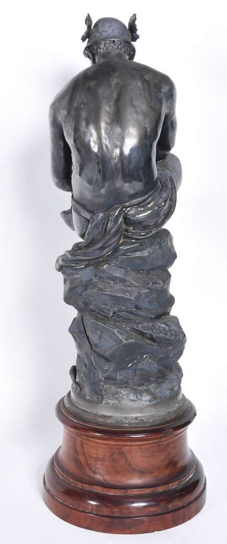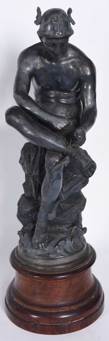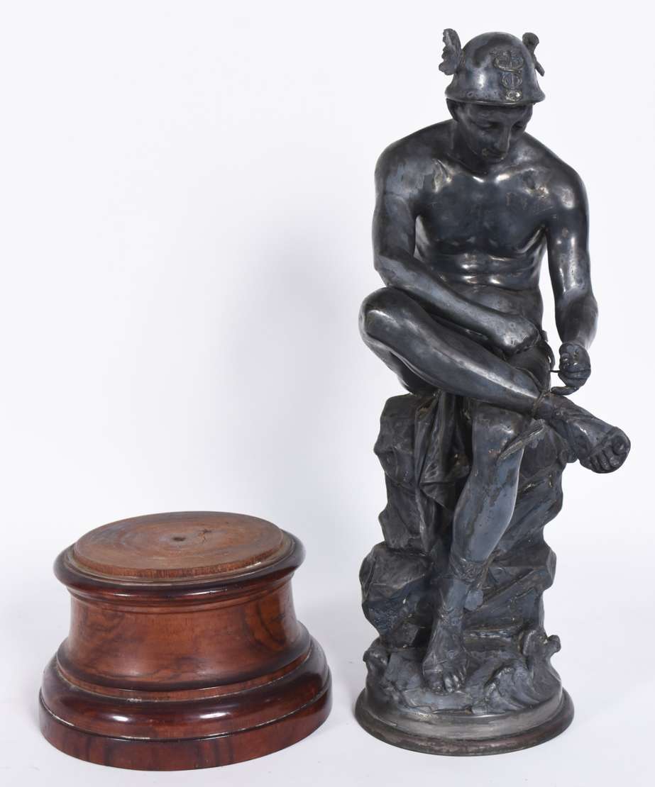 Duas esculturas de petit bronze, uma delas representando cavalo com base de madeira, e a outra, figura feminina com b...