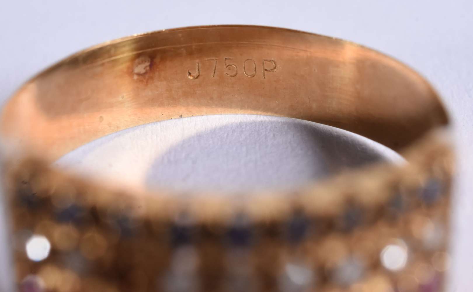 Anel de ouro 18 k, contraste 750 cravejado com safiras brancas, aro 15 (Por motivos de segurança a peça não se encont...