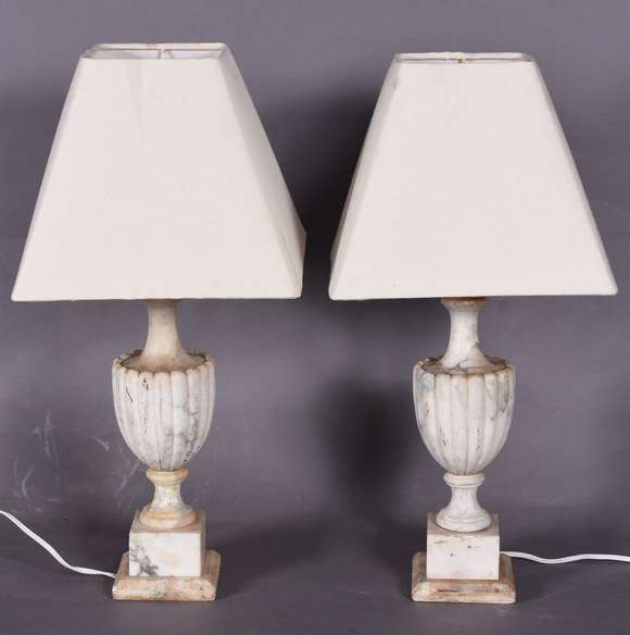 Par de abatjoures de alabastro, bases soltas de mármore. Acompanham cúpulas de tecido com desgastes. Um deles, ligeir...